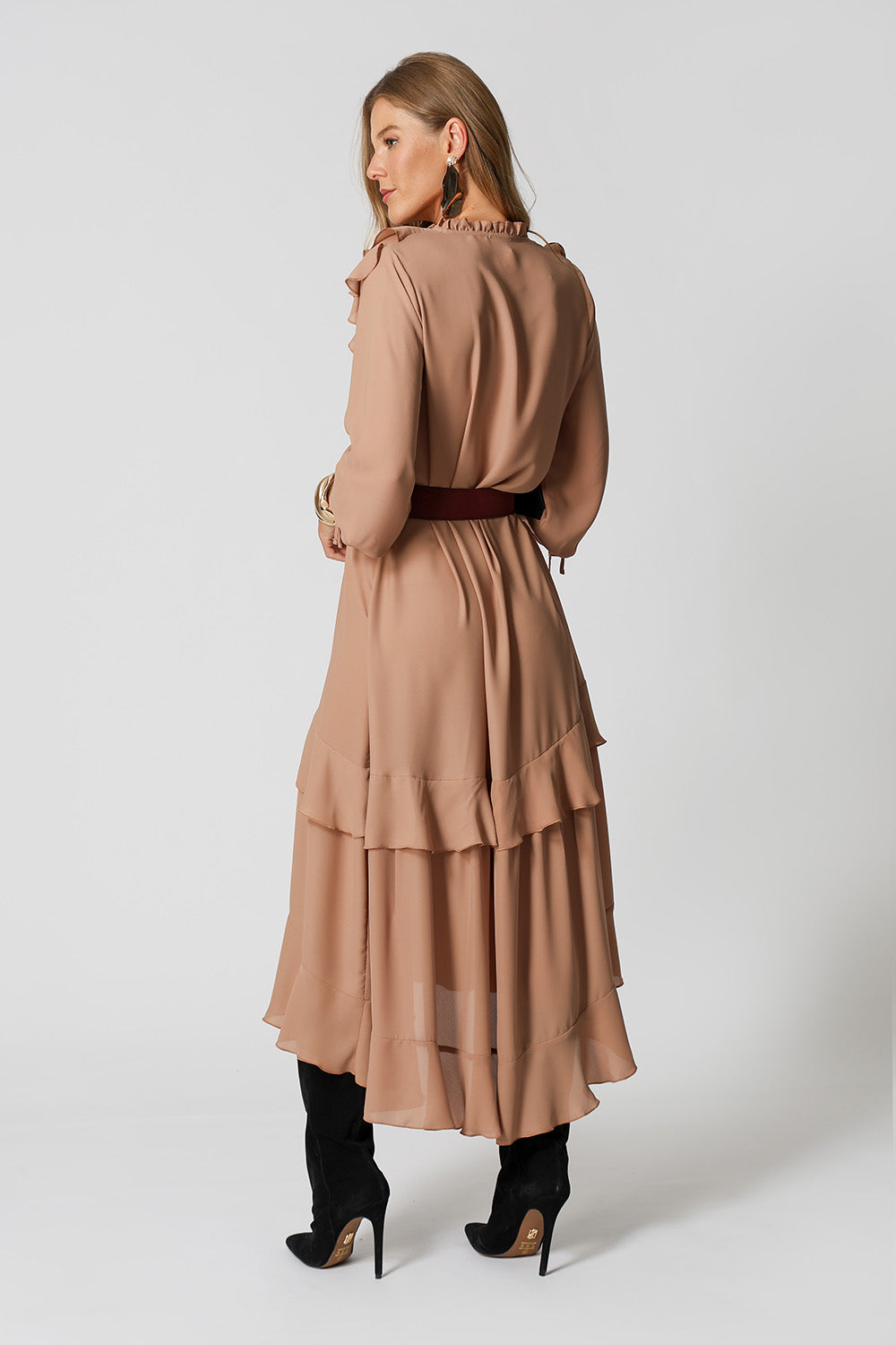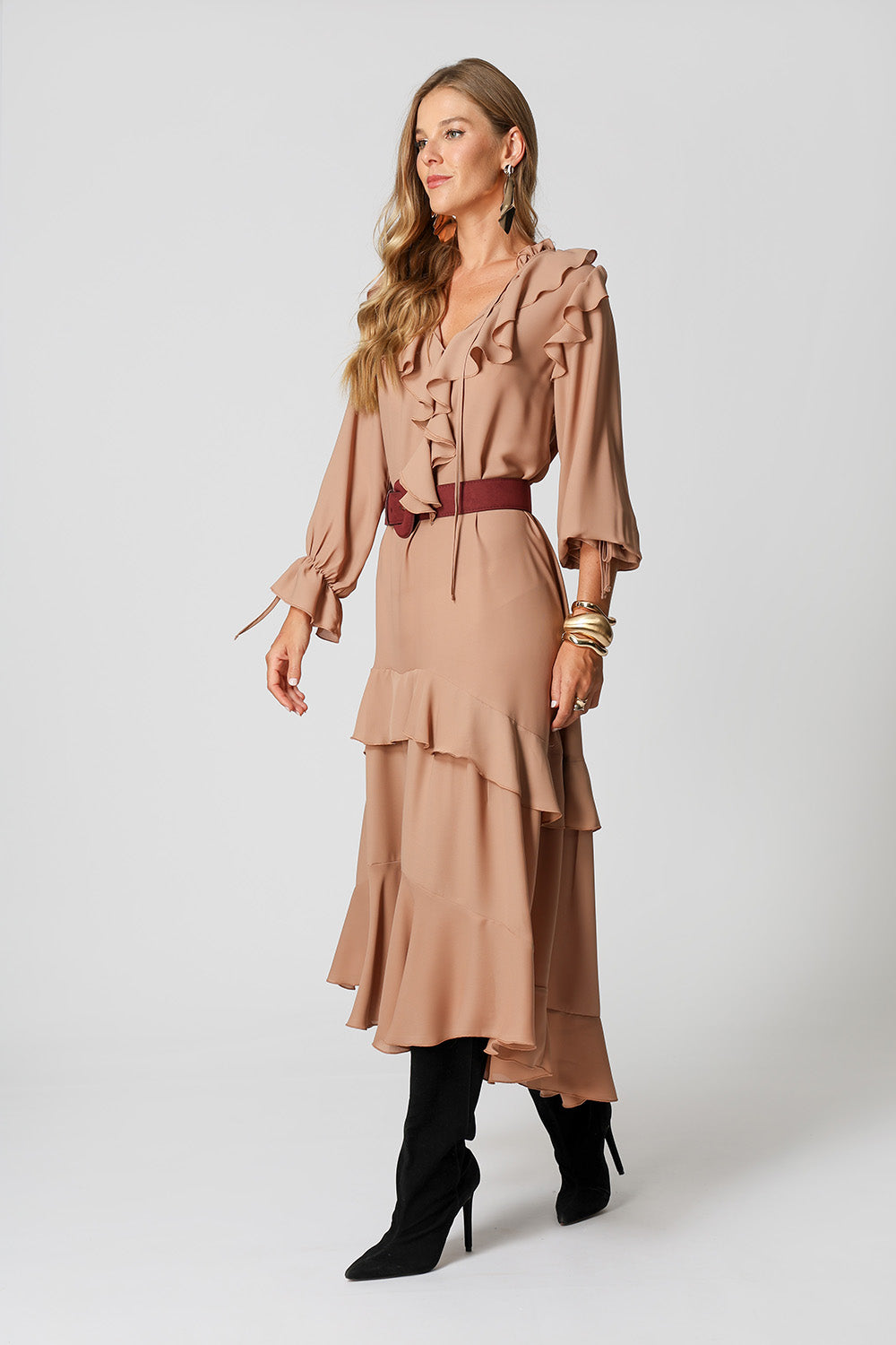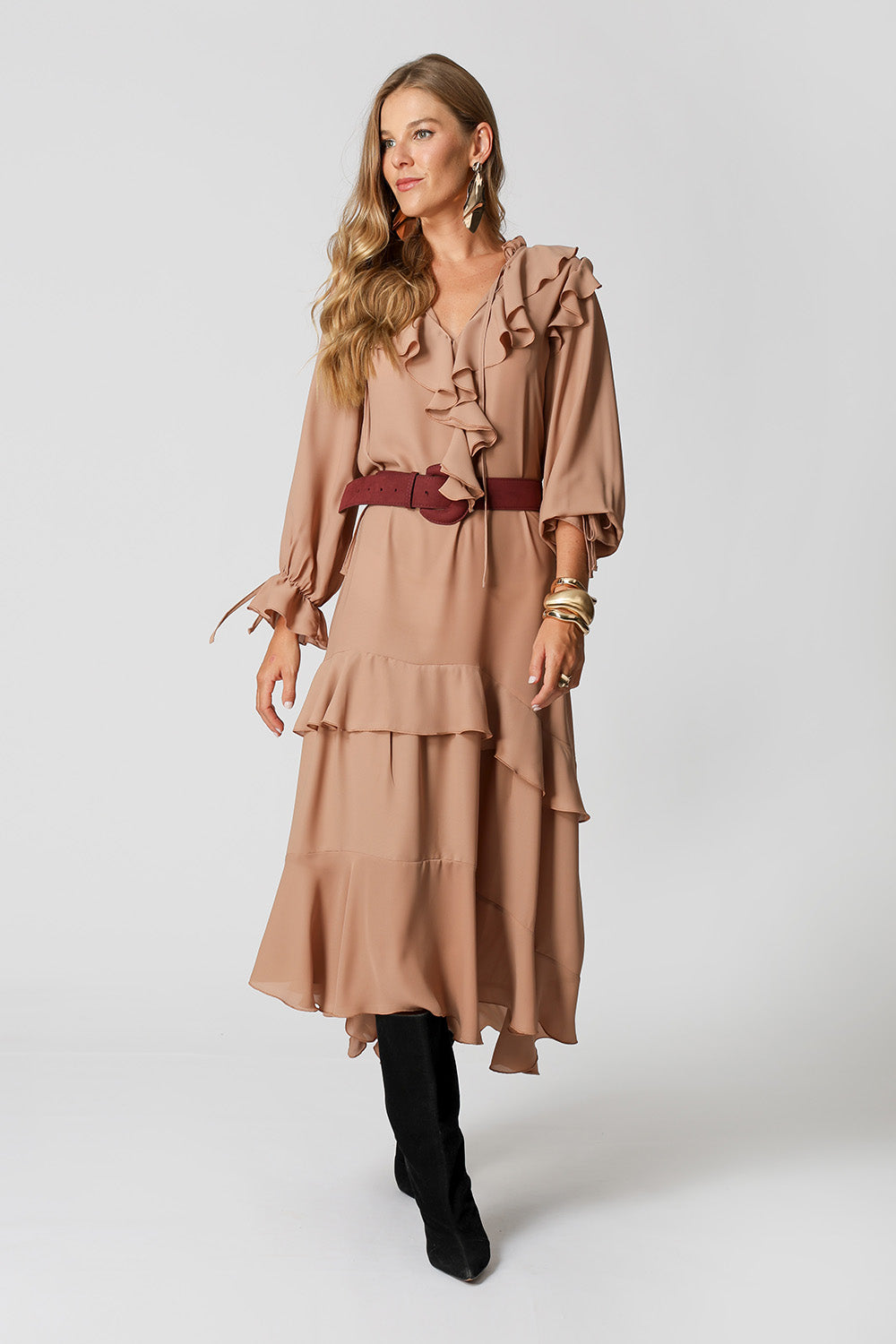 Vestido con volantes, diseño fluido que aporta ligereza y movimiento. Los volantes añaden un toque de sofisticación y estilo, haciéndolo perfecto para una variedad de ocasiones. ¡Es una elección maravillosa para quienes buscan comodidad sin sacrificar la moda!