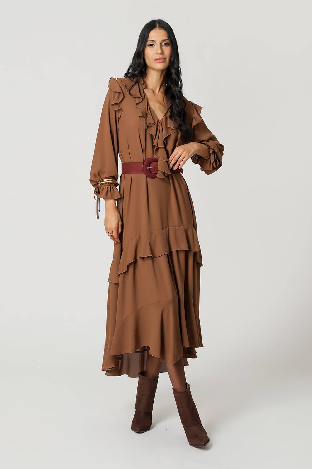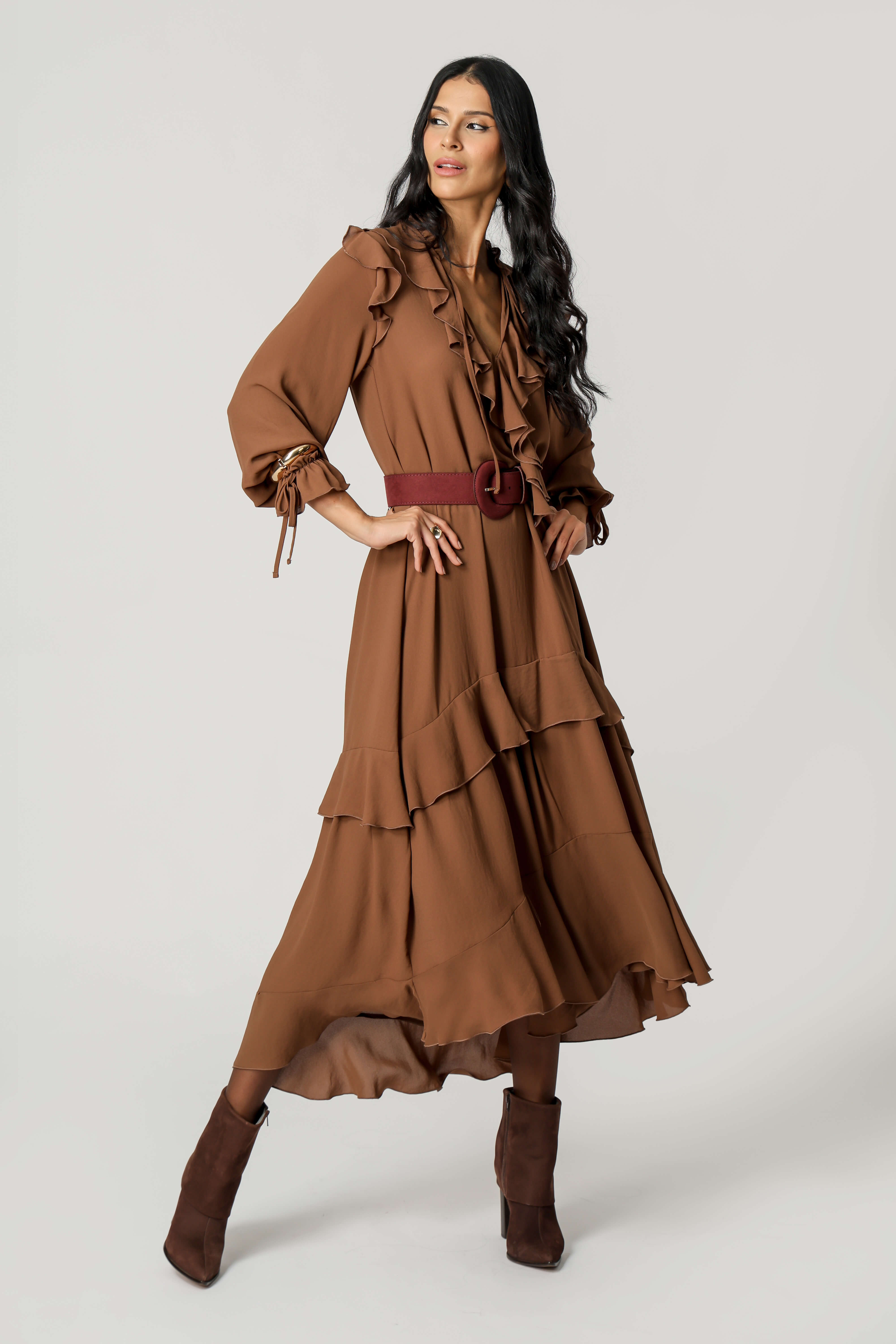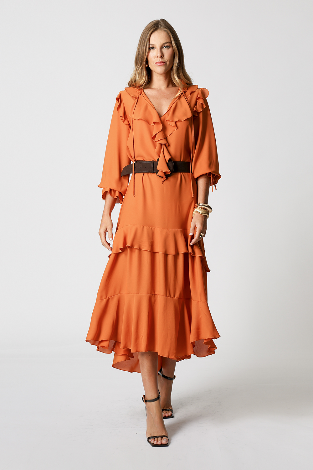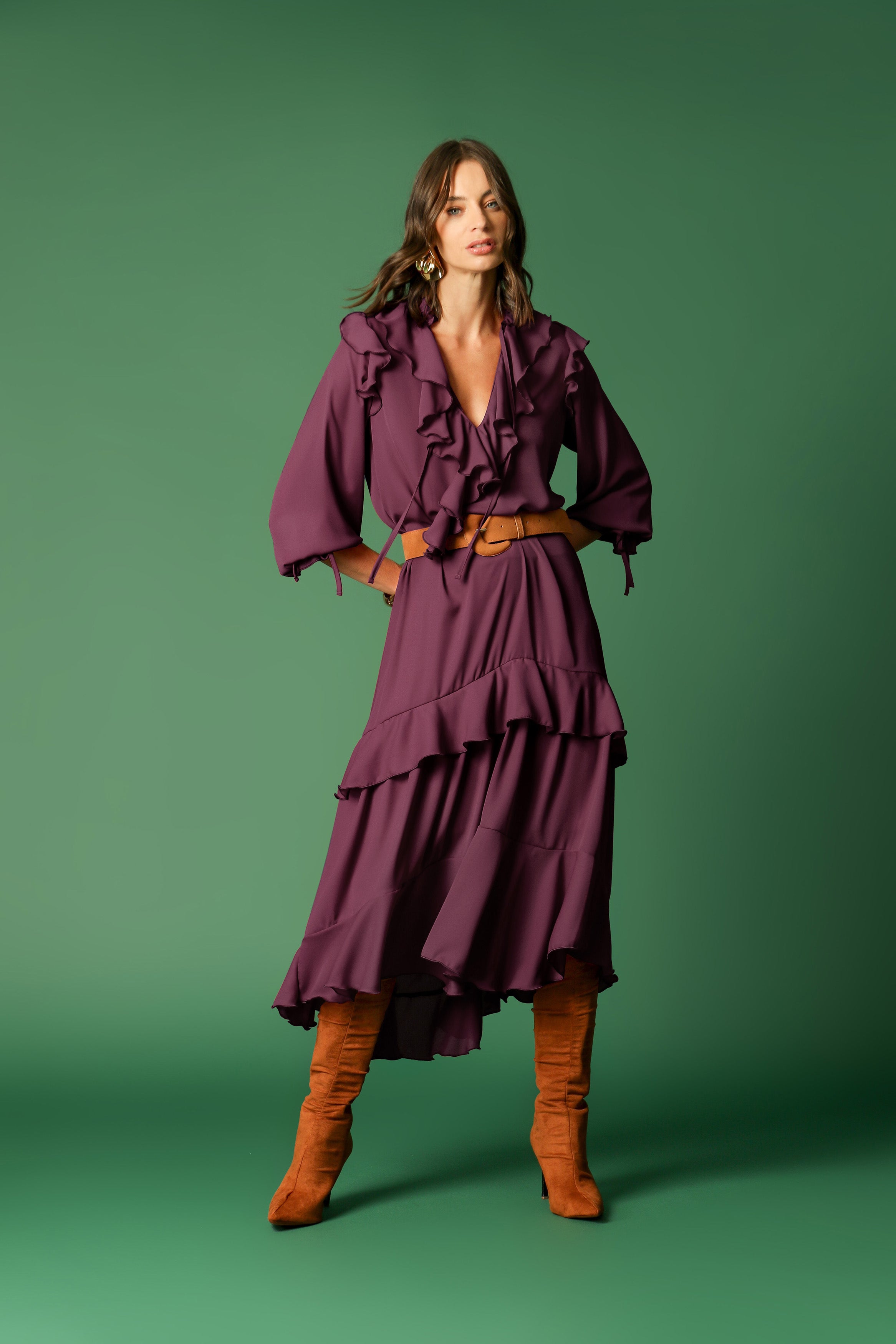 Vestido com babados, design fluido que traz leveza e movimento. Os babados adicionam um toque de sofisticação e estilo, tornando-o perfeito para diversas ocasiões. É uma escolha maravilhosa para quem busca conforto sem abrir mão da moda!