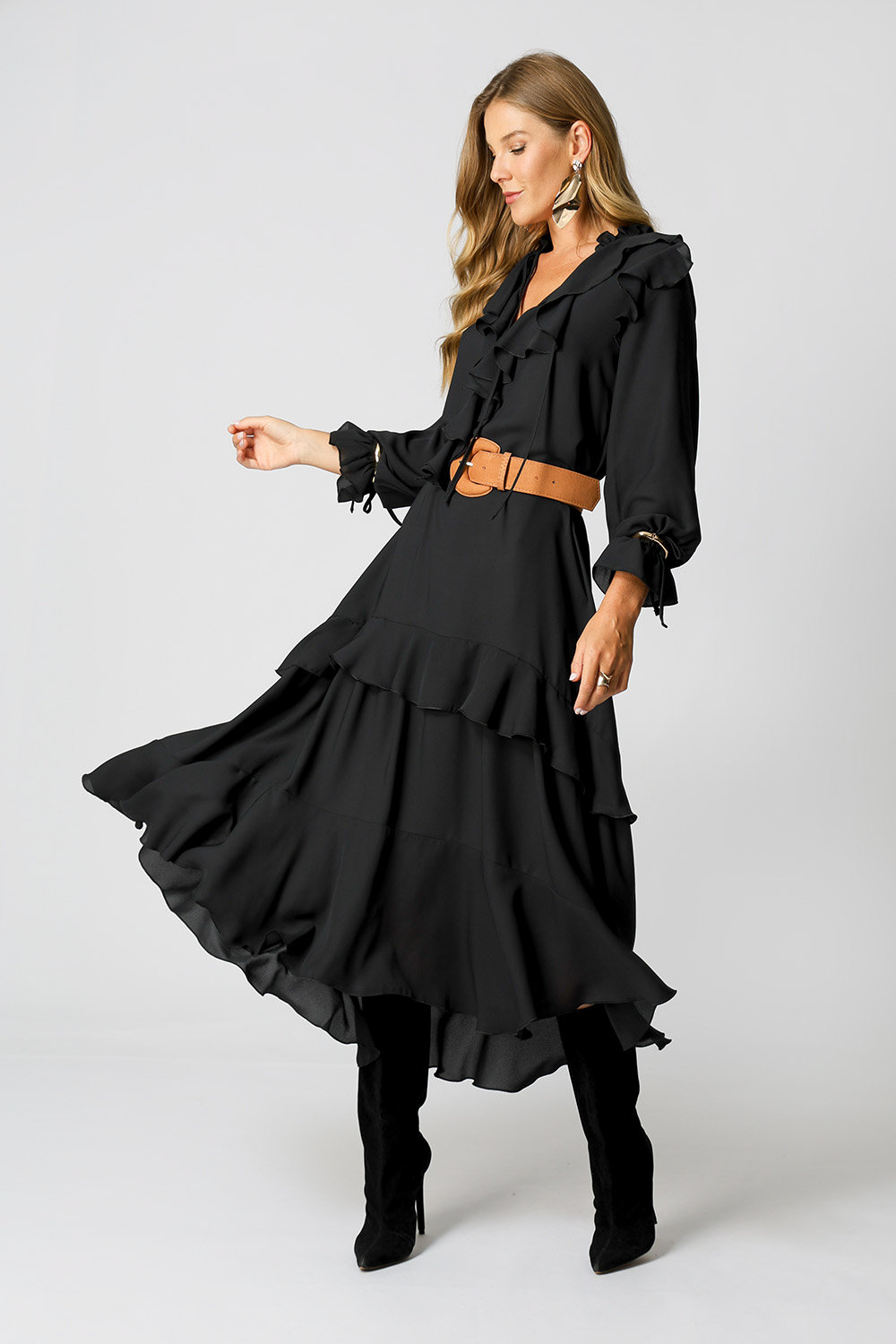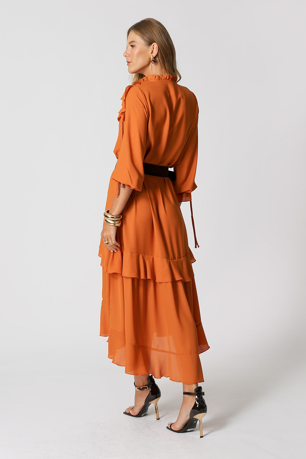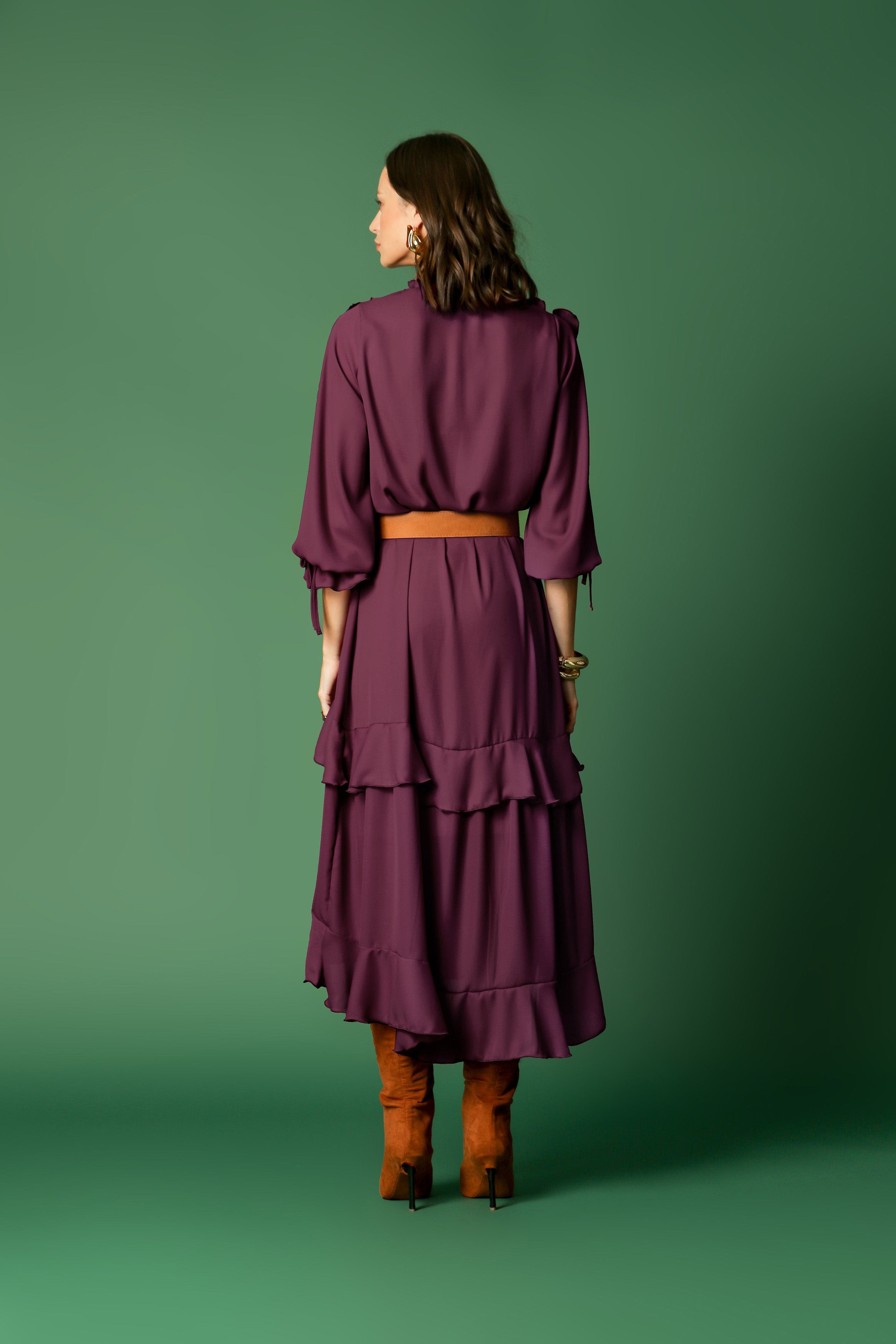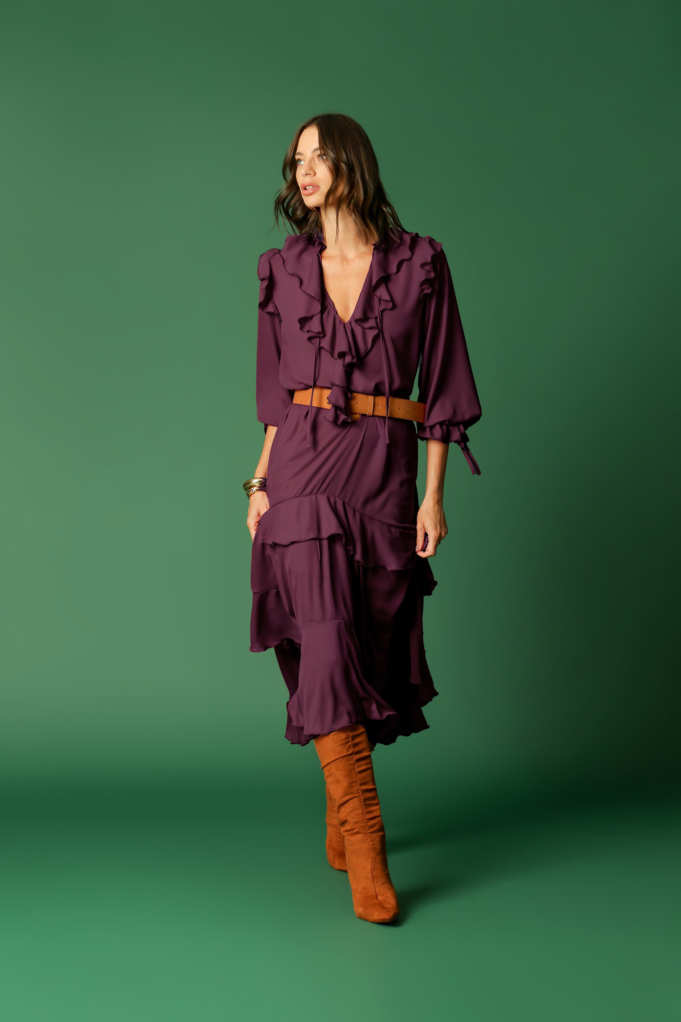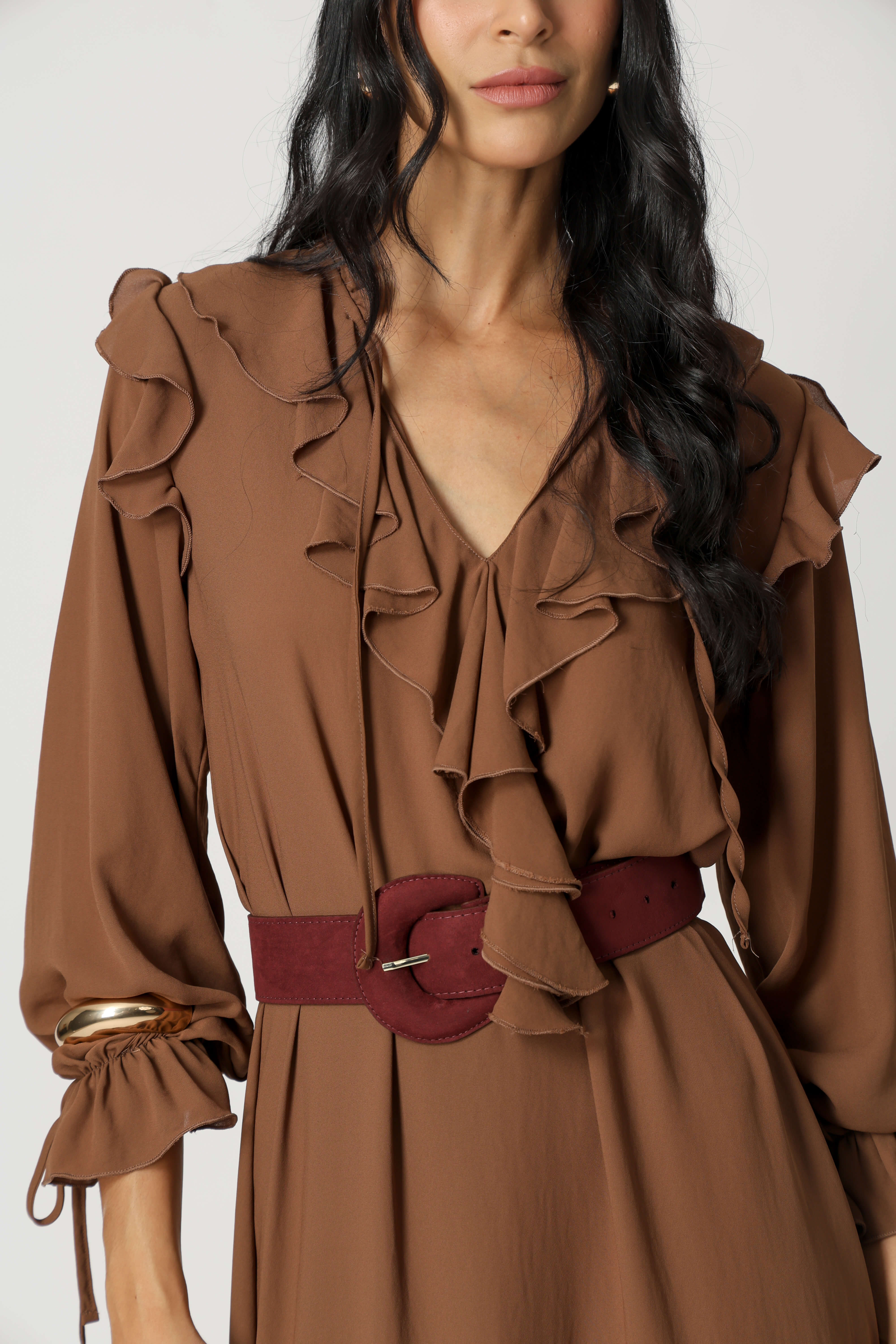 Vestido com babados, design fluido que traz leveza e movimento. Os babados adicionam um toque de sofisticação e estilo, tornando-o perfeito para diversas ocasiões. É uma escolha maravilhosa para quem busca conforto sem abrir mão da moda!