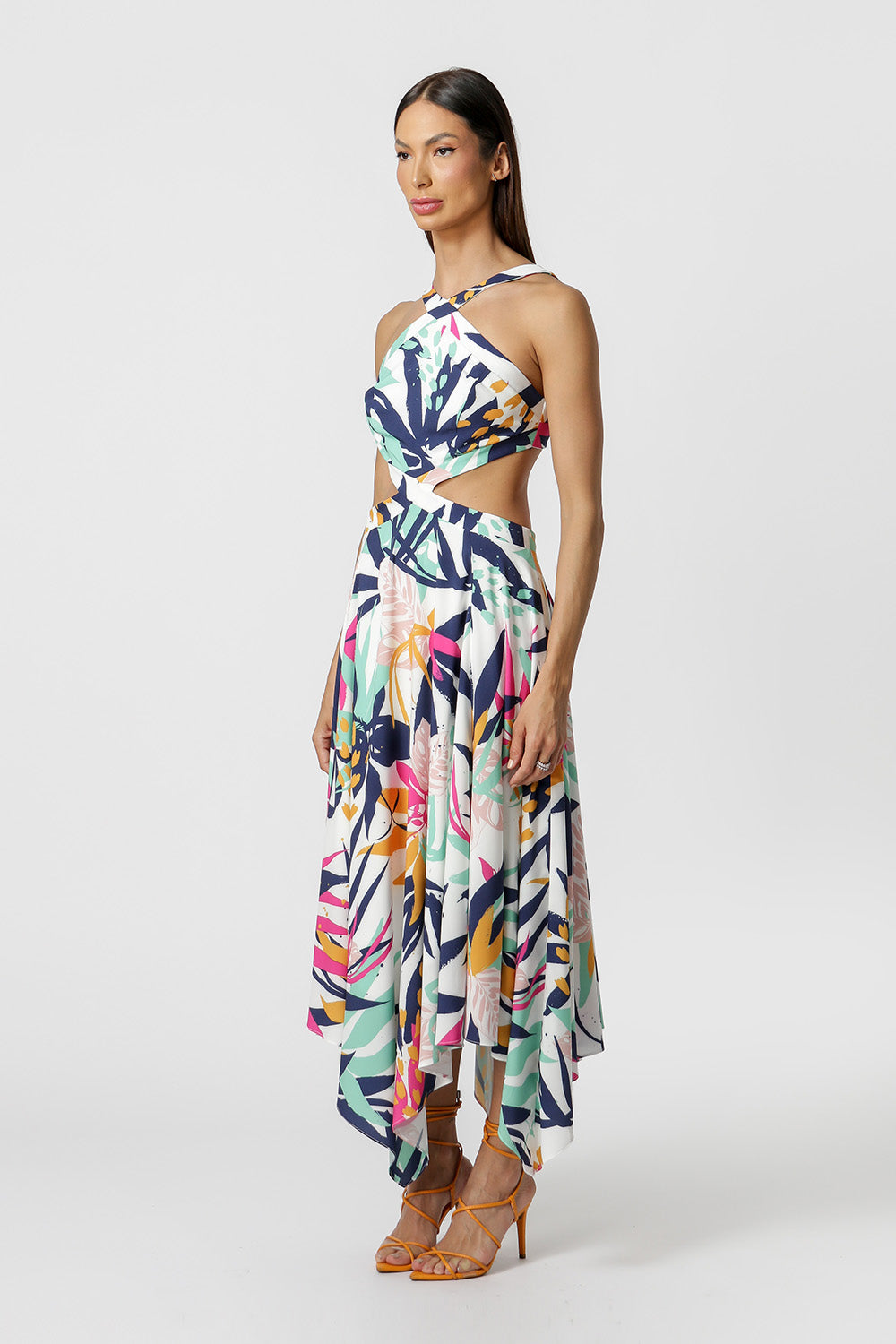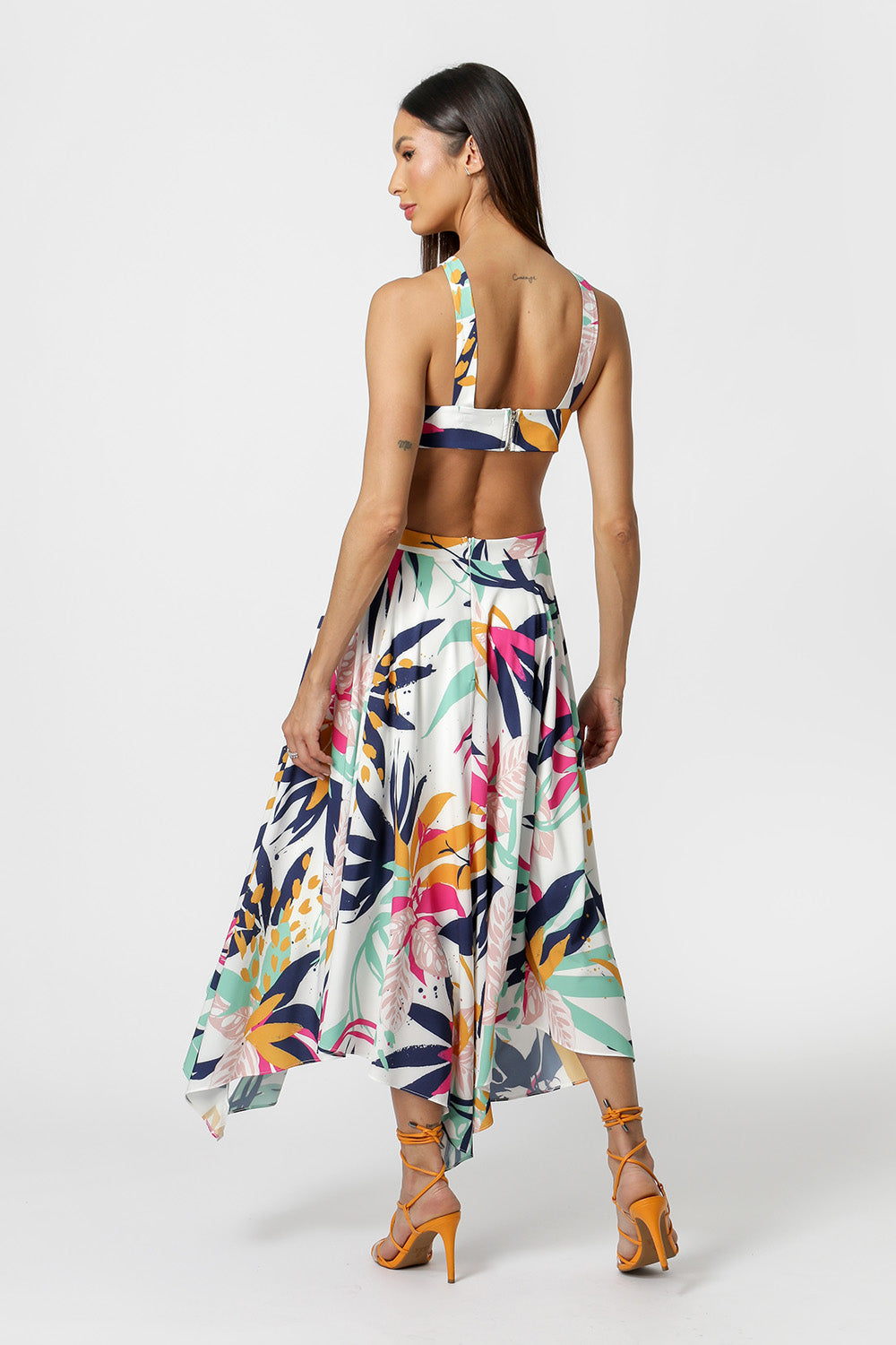 Vestido con bajo asimétrico. Pieza realizada en tejido fluido. Modelo ideal para lucir el verano con mucho estilo.