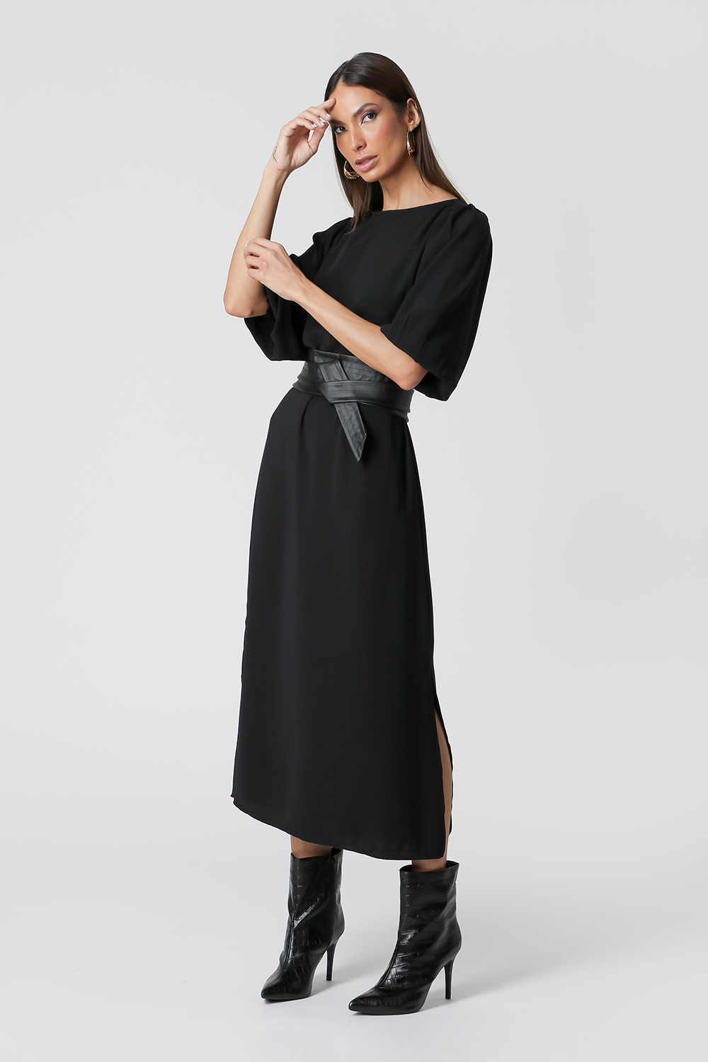 Vestido con corte más recto y mangas más anchas. Tiene detalle elástico en el puño y viene con un cinturón de resina. Una pieza sofisticada y elegante, ideal para ocasiones especiales.