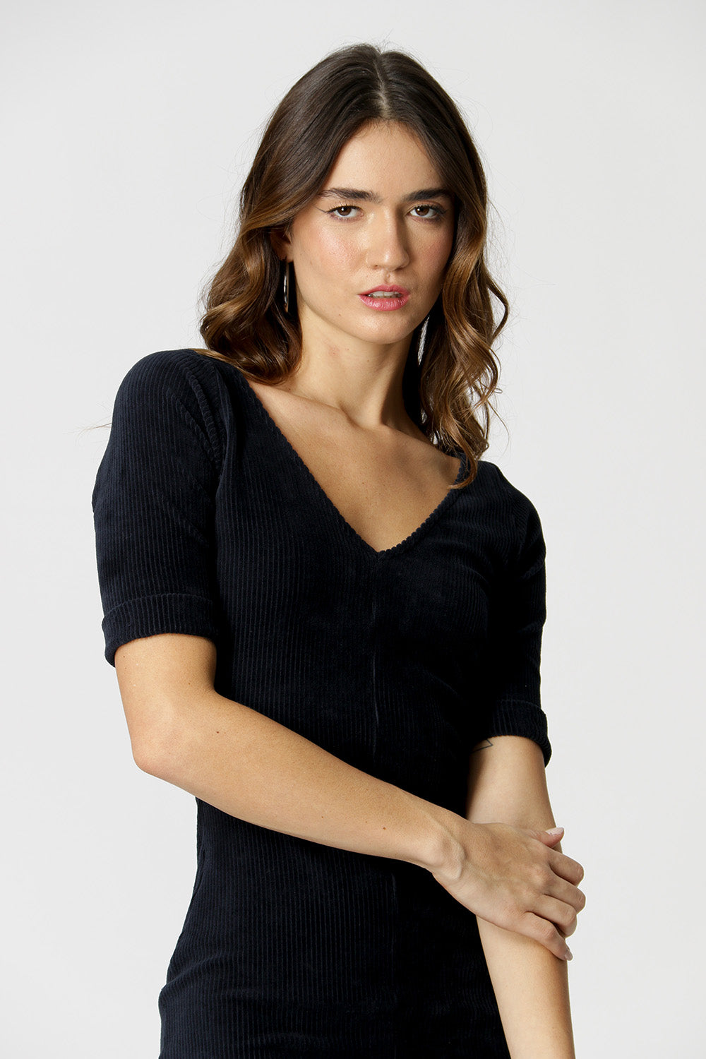 Vestido de largo medio con espalda en V. Fabricado en tejido de pana y lycra. Una pieza cómoda y casual para rockear.