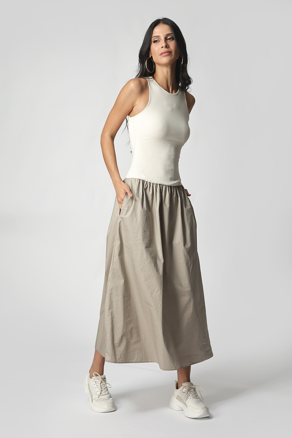 Vestido con mezcla de tejidos, tiene bolsillos laterales, modelo casual y con estilo para atreverte en ocasiones casuales.