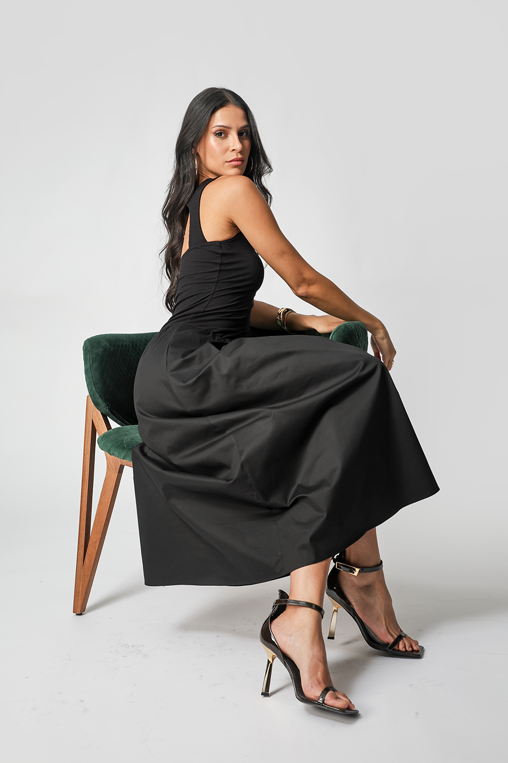 Vestido con mezcla de tejidos, tiene bolsillos laterales, modelo casual y con estilo para atreverte en ocasiones casuales.