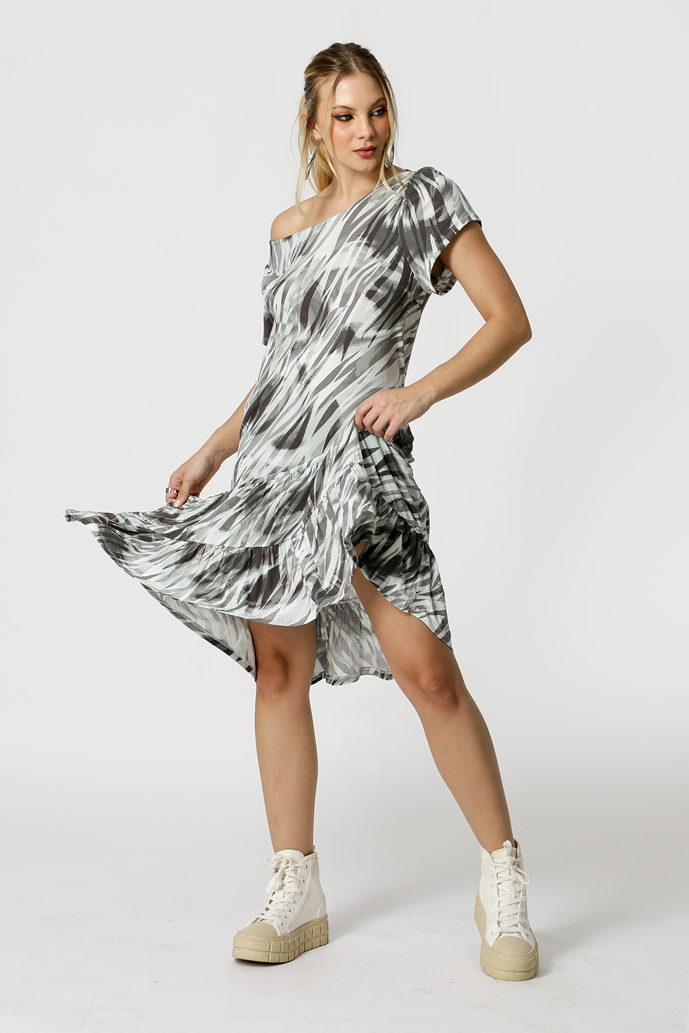 Vestido corto con volantes y manga corta. Pieza confeccionada en tejido de punto de viscosa estampado. Una pieza con un ajuste súper cómodo y perfecta para un ambiente casual.