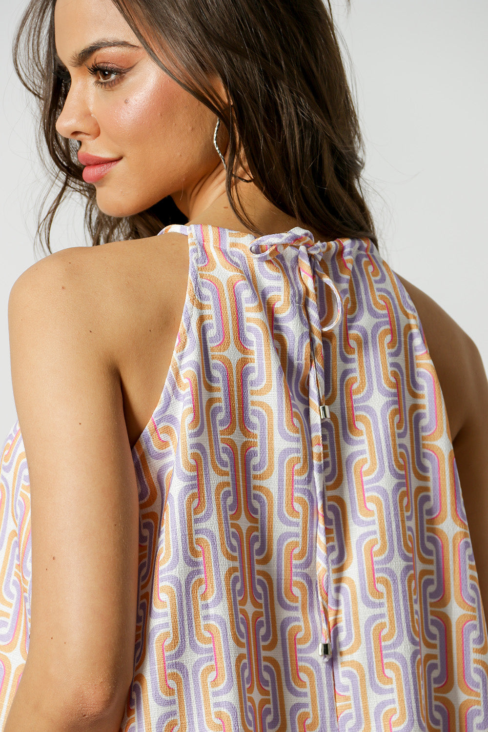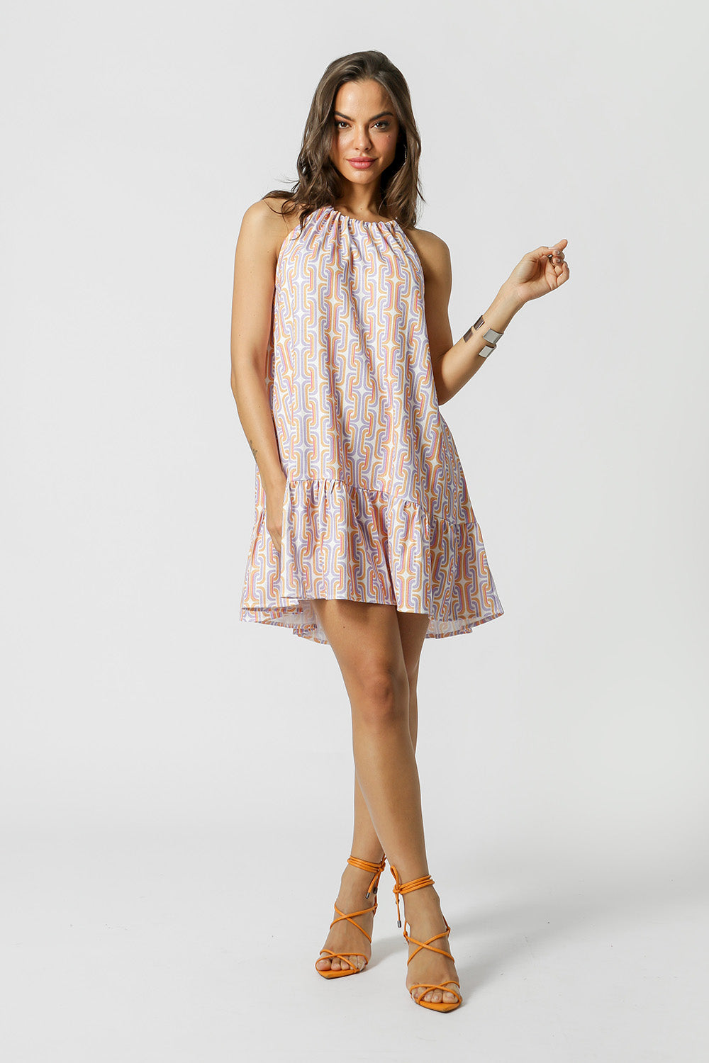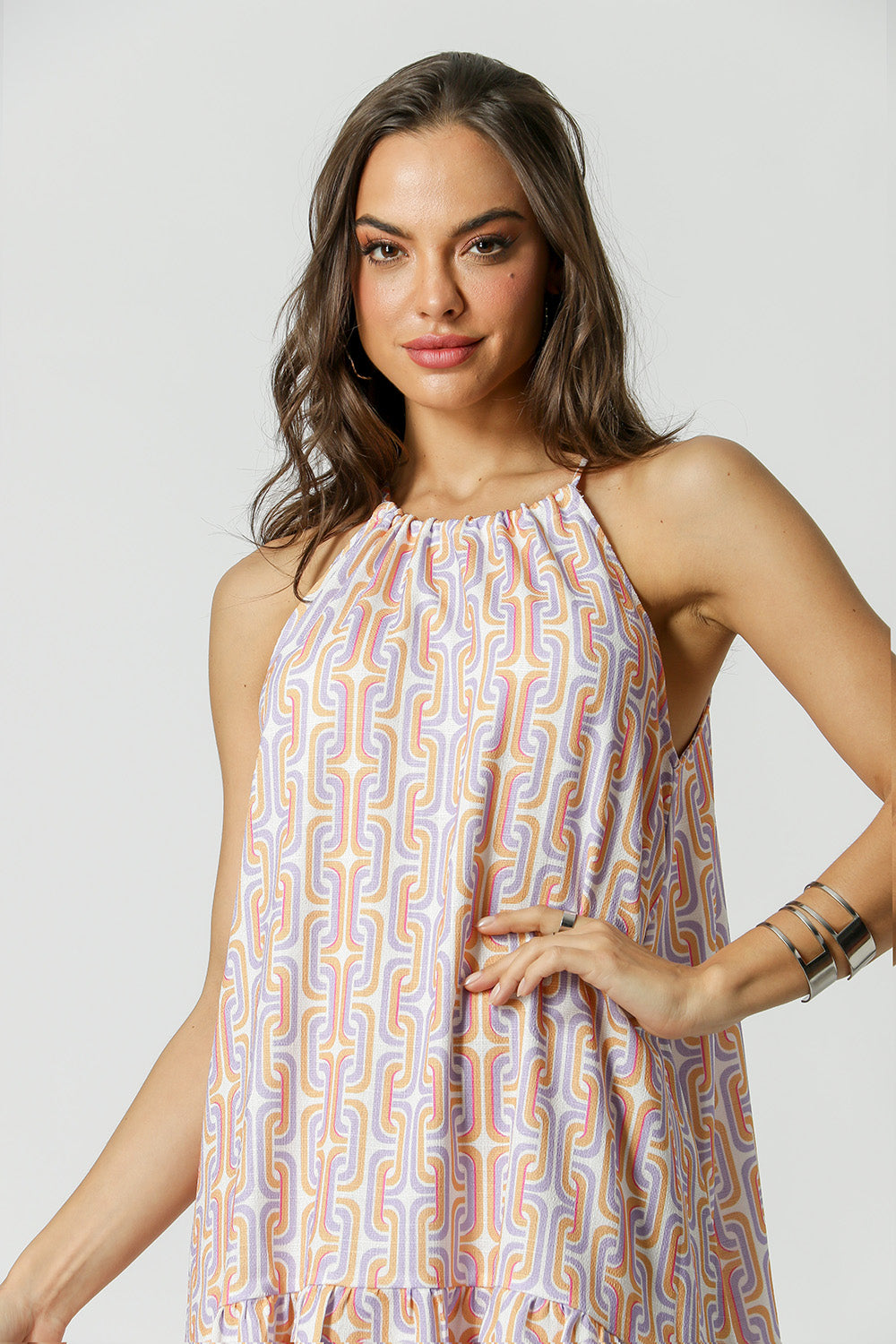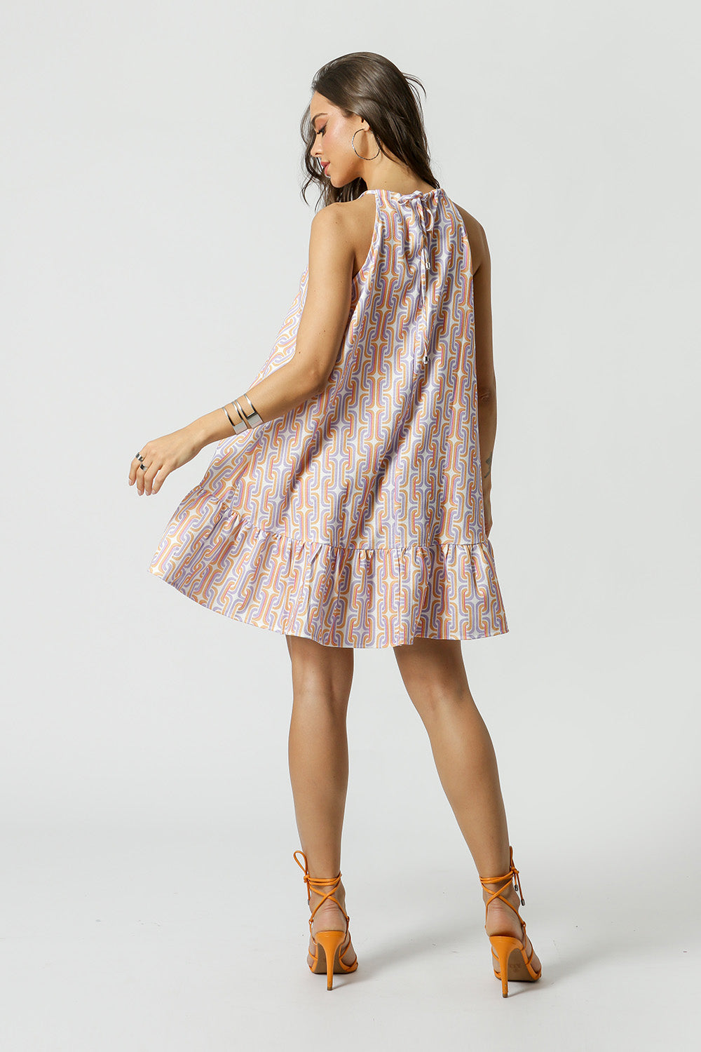 Vestido con volantes, largo corto y tirantes ajustables con puntas de metal niquelado, corte suelto y casual para un look casual.