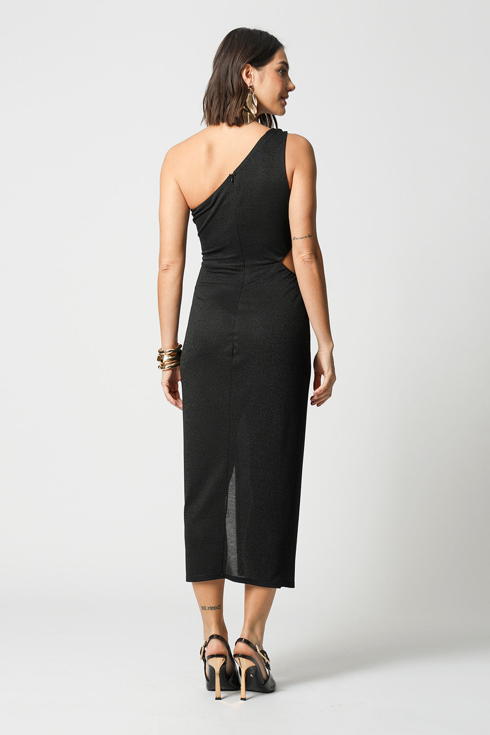 Tiene tres accesorios dorados, un corte en la cintura y una abertura frontal.
