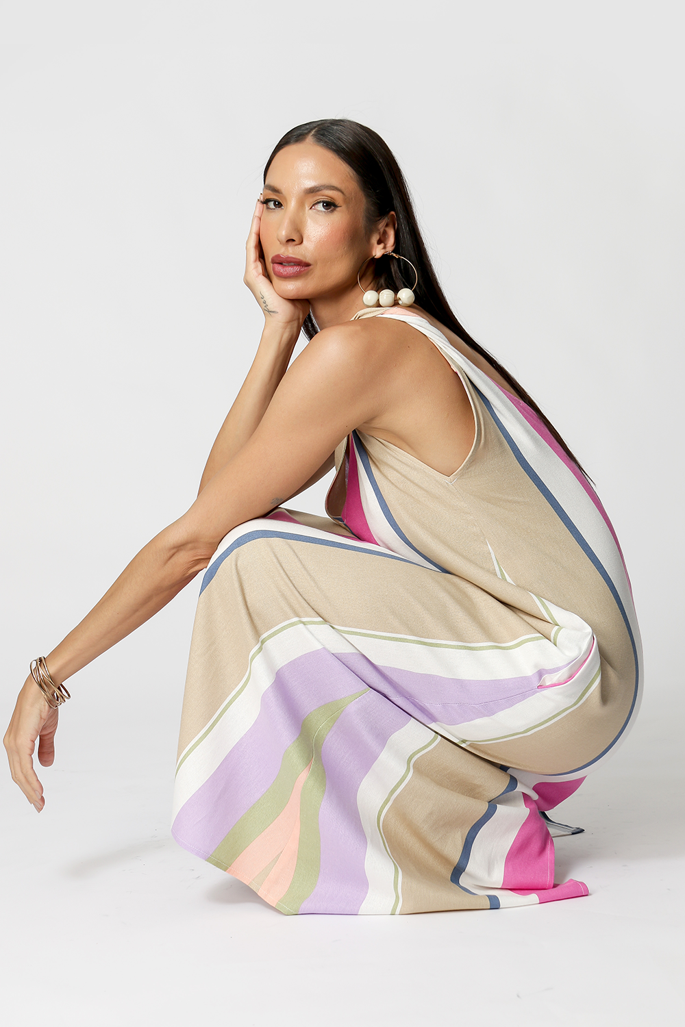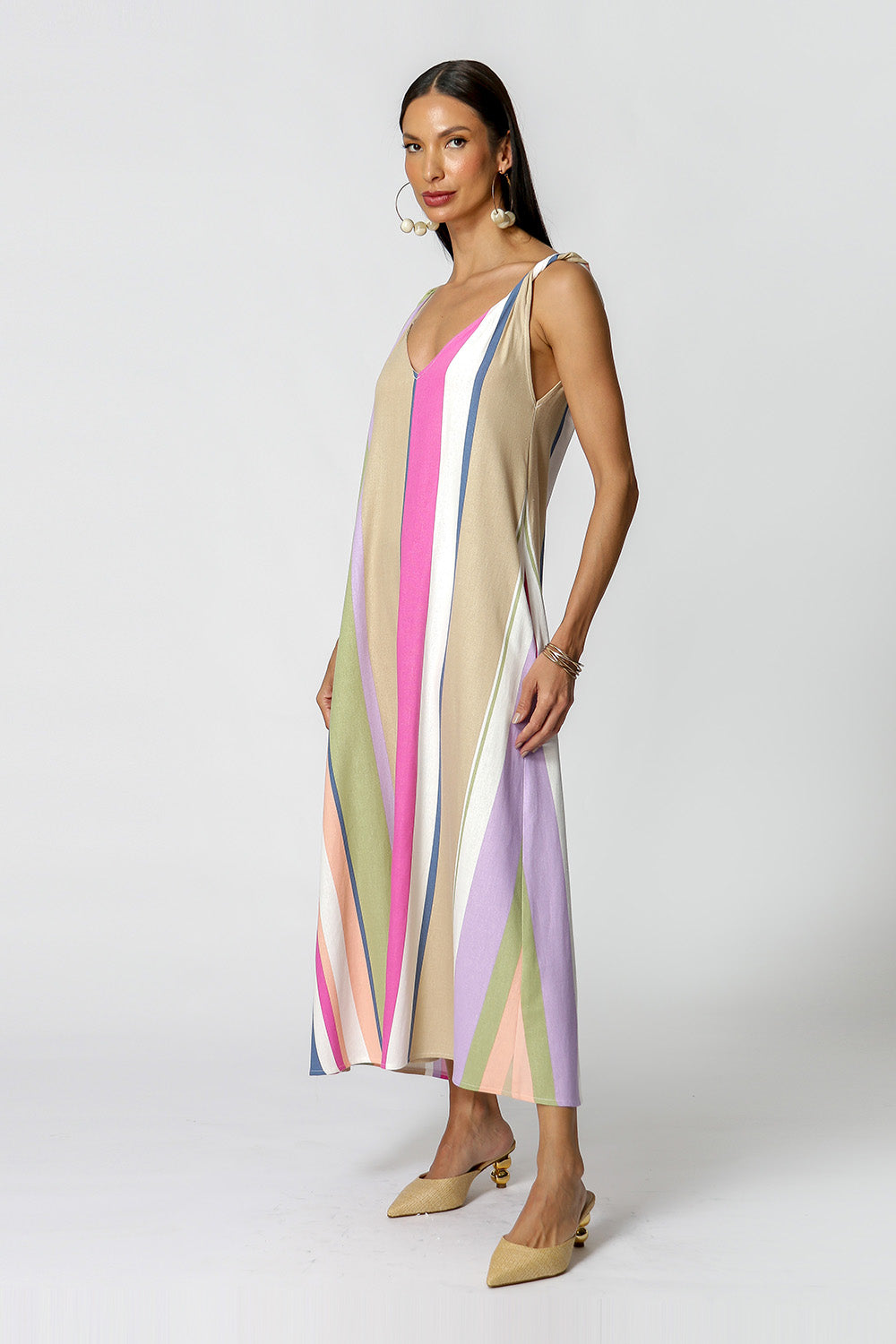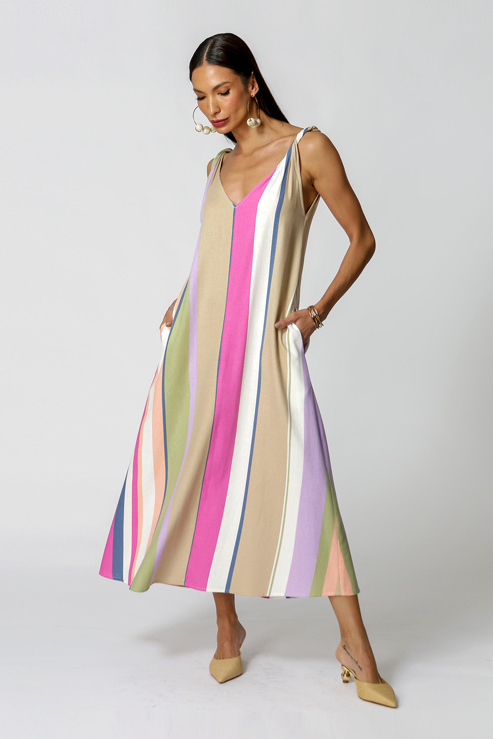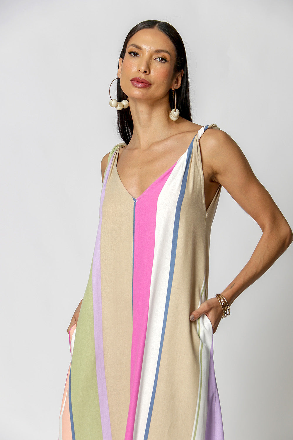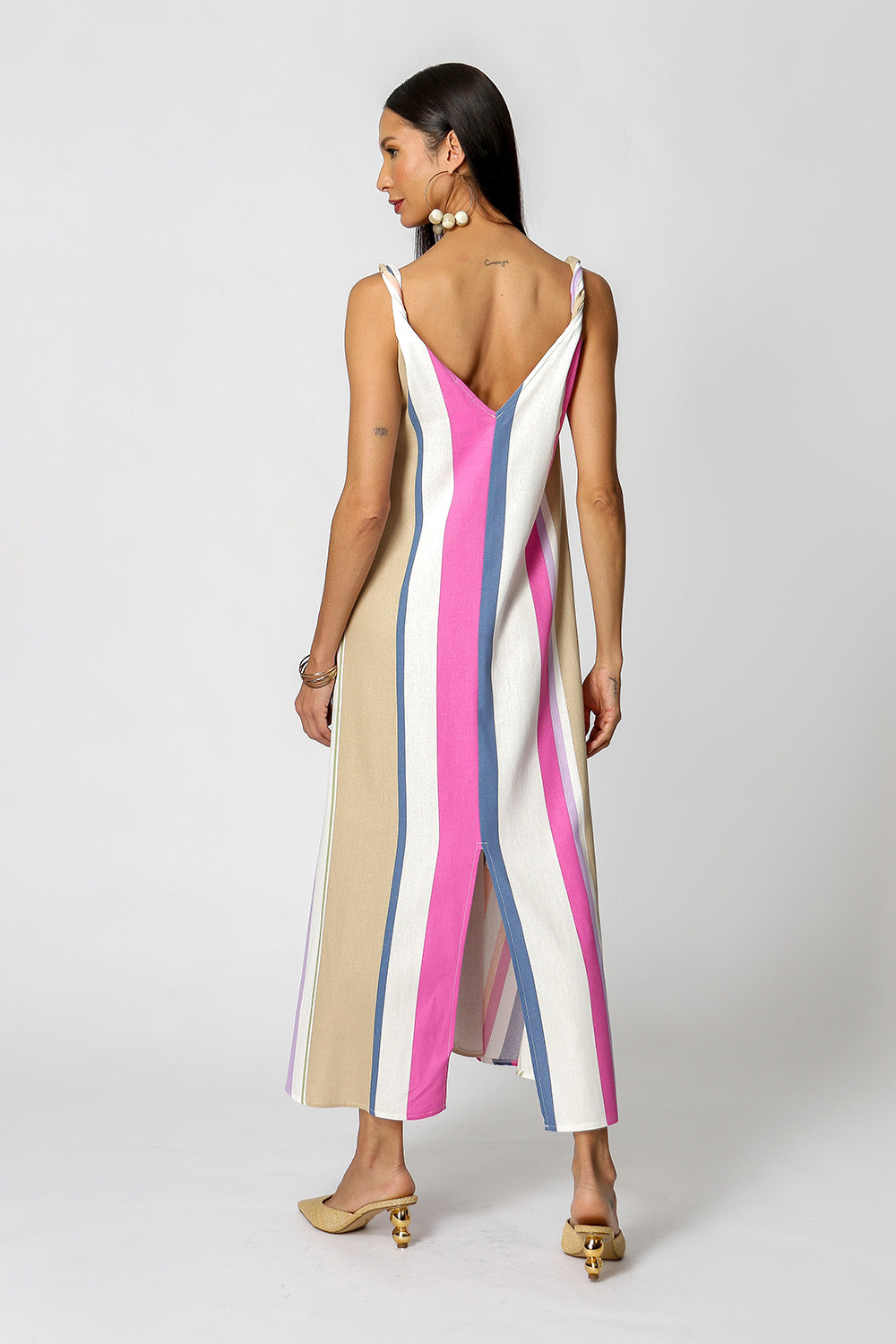 Tiene tirantes retorcidos, abertura en la espalda y bolsillos laterales.