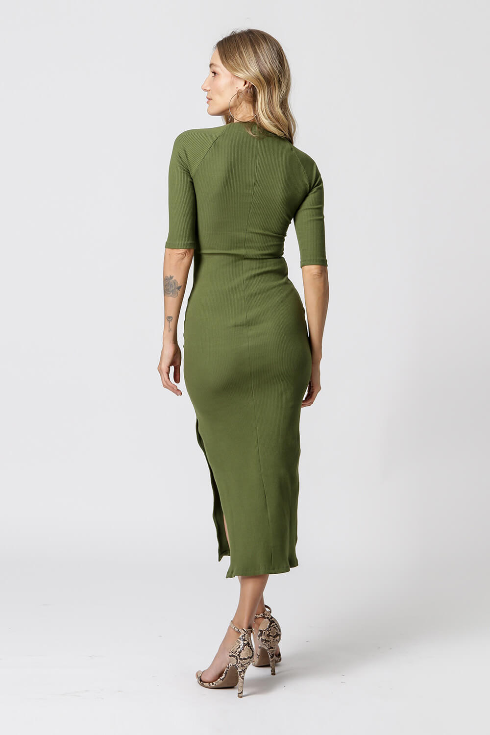 Vestido de largo medio con escote y mangas princesa, detalle de abertura lateral. Un modelo básico y moderno para un look casual.
