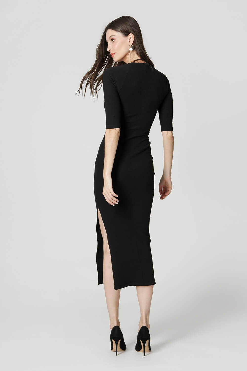 Vestido de largo medio con escote y mangas princesa, detalle de abertura lateral. Un modelo básico y moderno para un look casual.