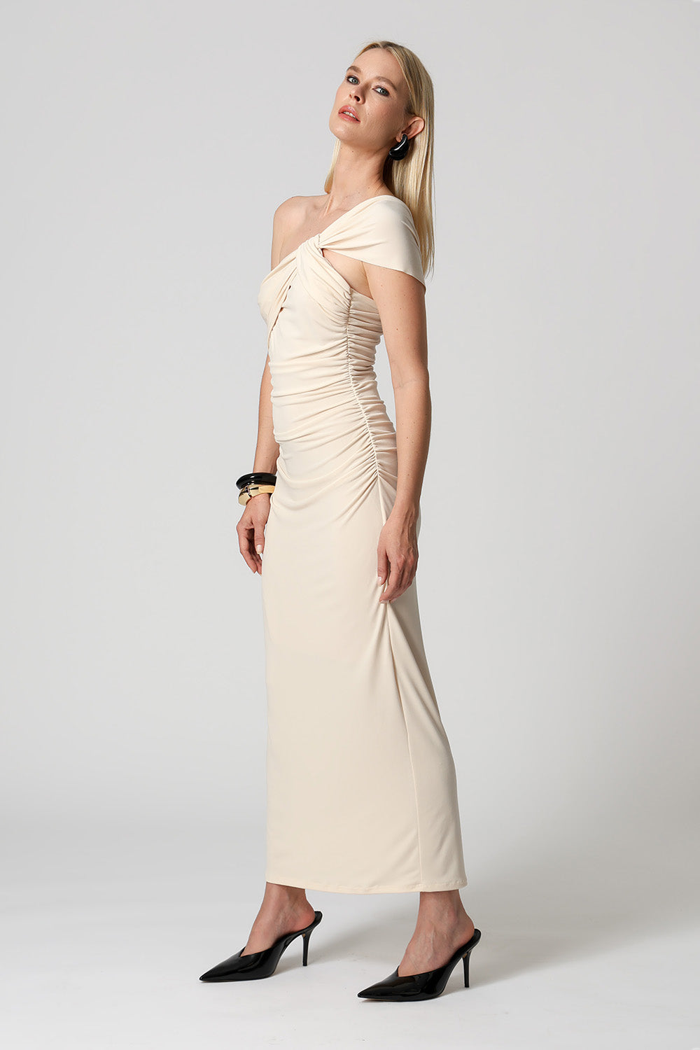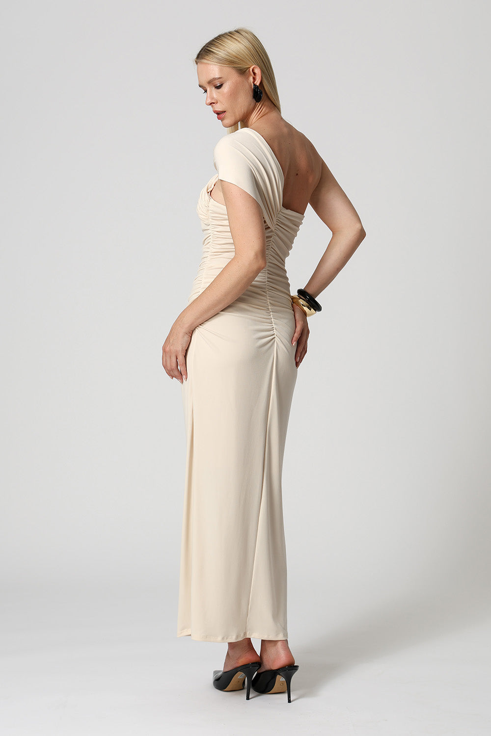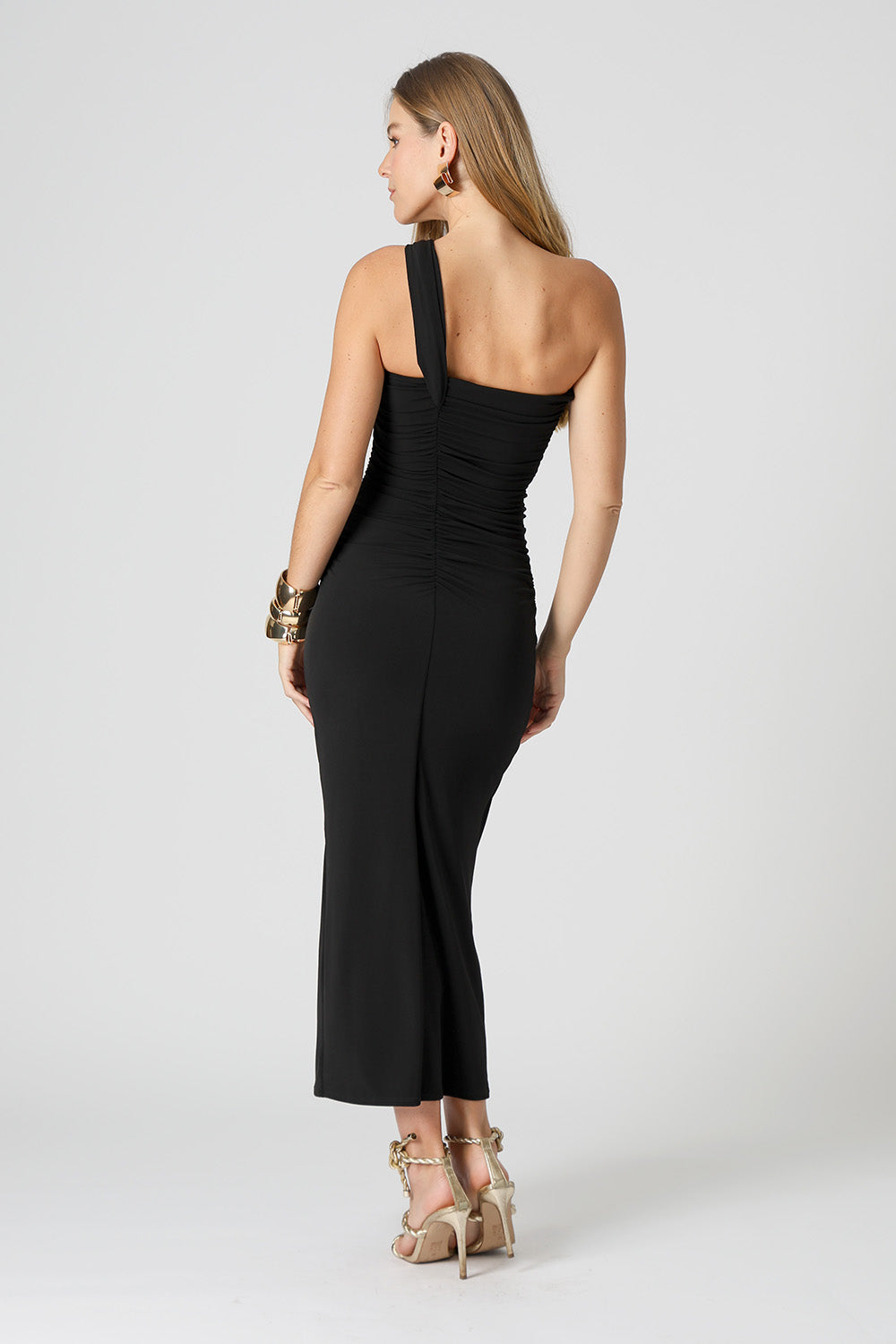 Elegante e moderno, este vestido de um ombro só é confeccionado em malha ITY com caimento leve e confortável. Possui detalhe drapeado e franzido no ombro, realçando a silhueta com sofisticação. Ideal para eventos ou ocasiões especiais.