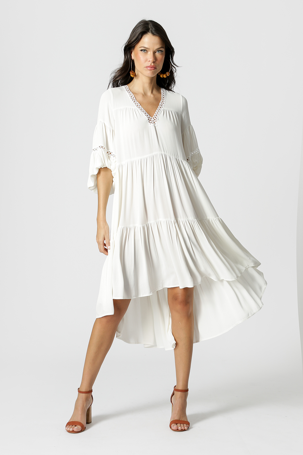 Vestido de largo midi con delicado encaje de algodón en escote y mangas, volumen en capas confeccionado en viscosa fluida.