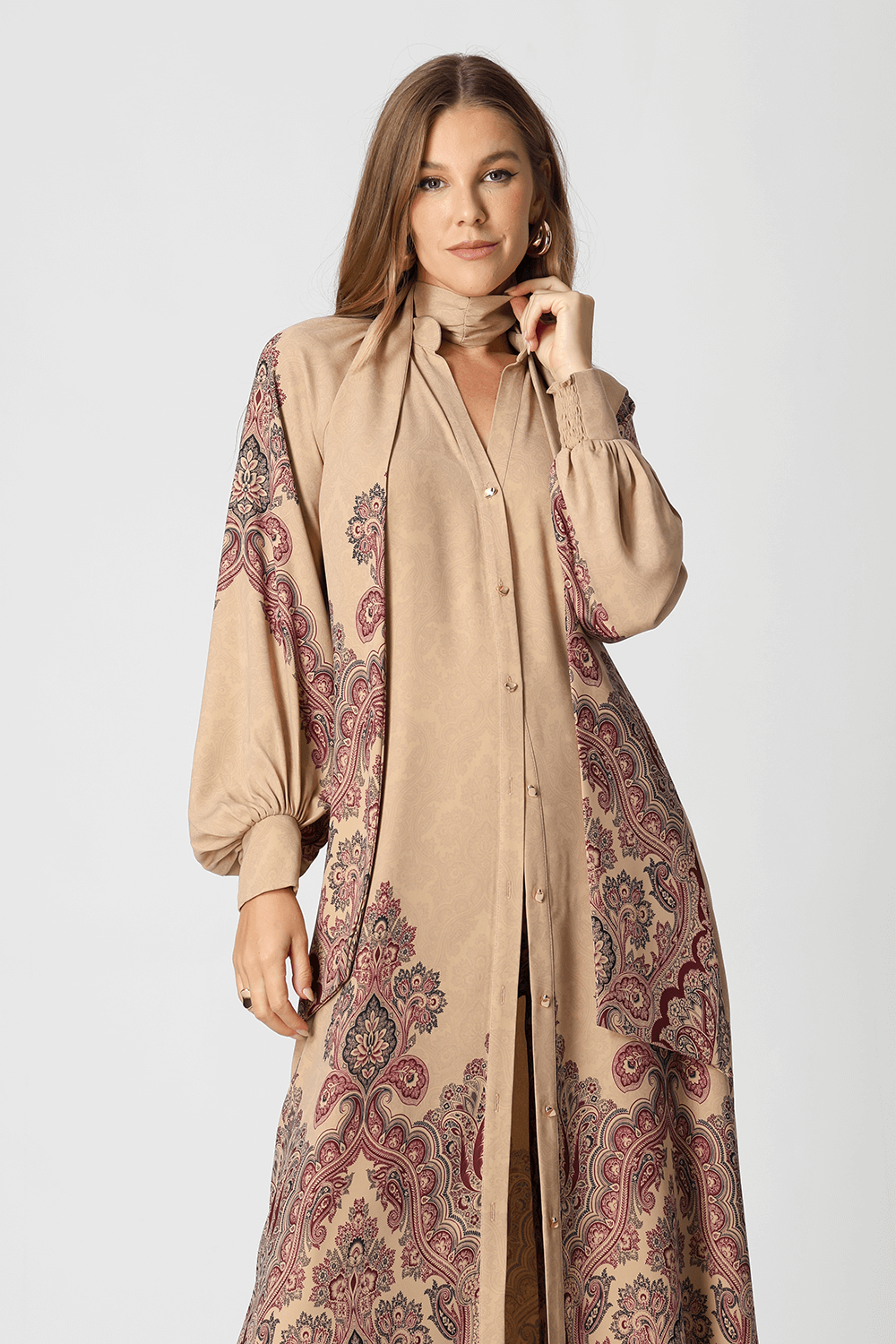 Vestido em crepe fluido premium com estampa localizada que valoriza a silhueta. Possui abertura frontal, punhos com elástico e faixa para amarração na cintura, garantindo ajuste perfeito e elegância com conforto.