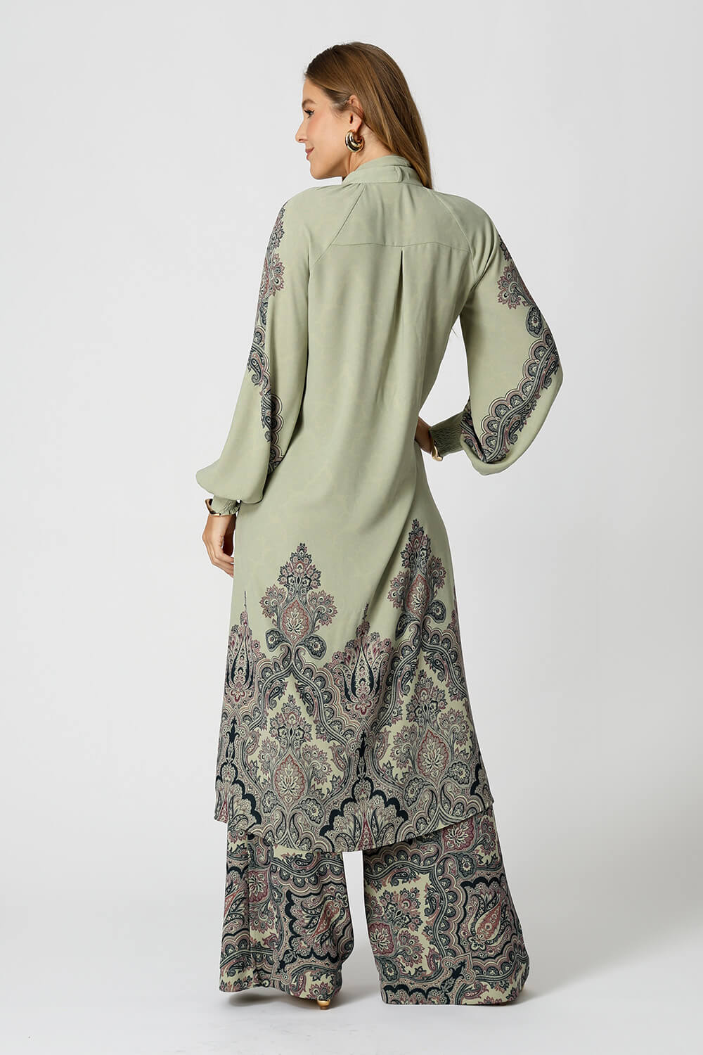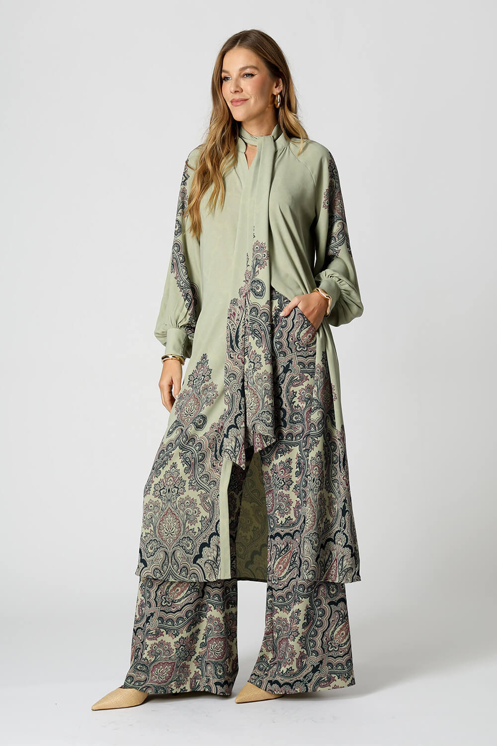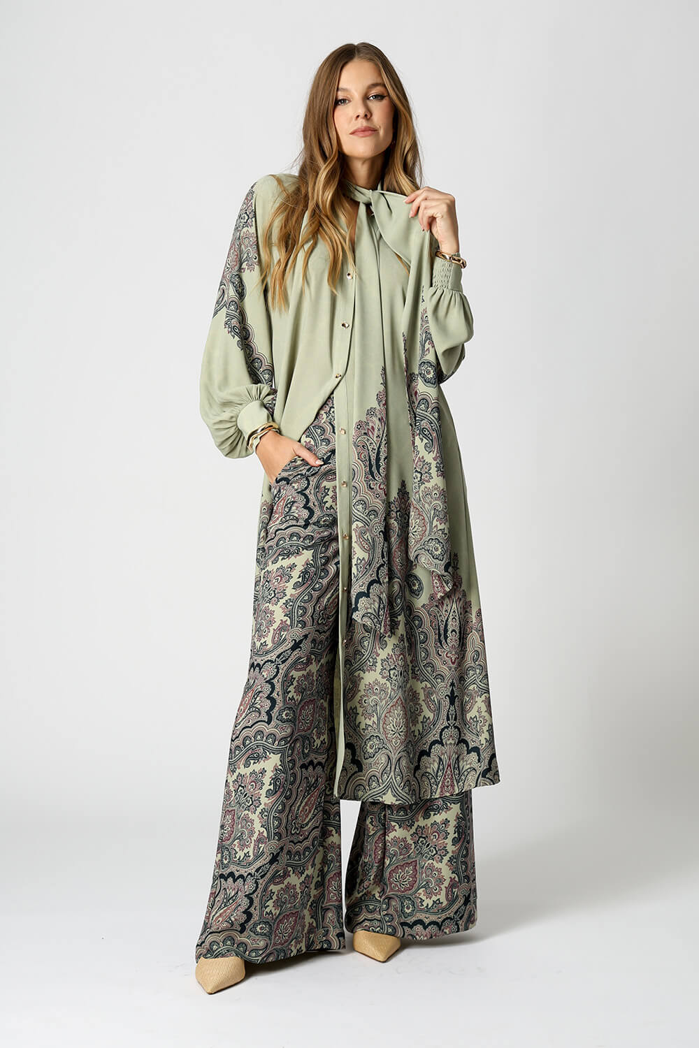 Vestido em crepe fluido premium com estampa localizada que valoriza a silhueta. Possui abertura frontal, punhos com elástico e faixa para amarração na cintura, garantindo ajuste perfeito e elegância com conforto.