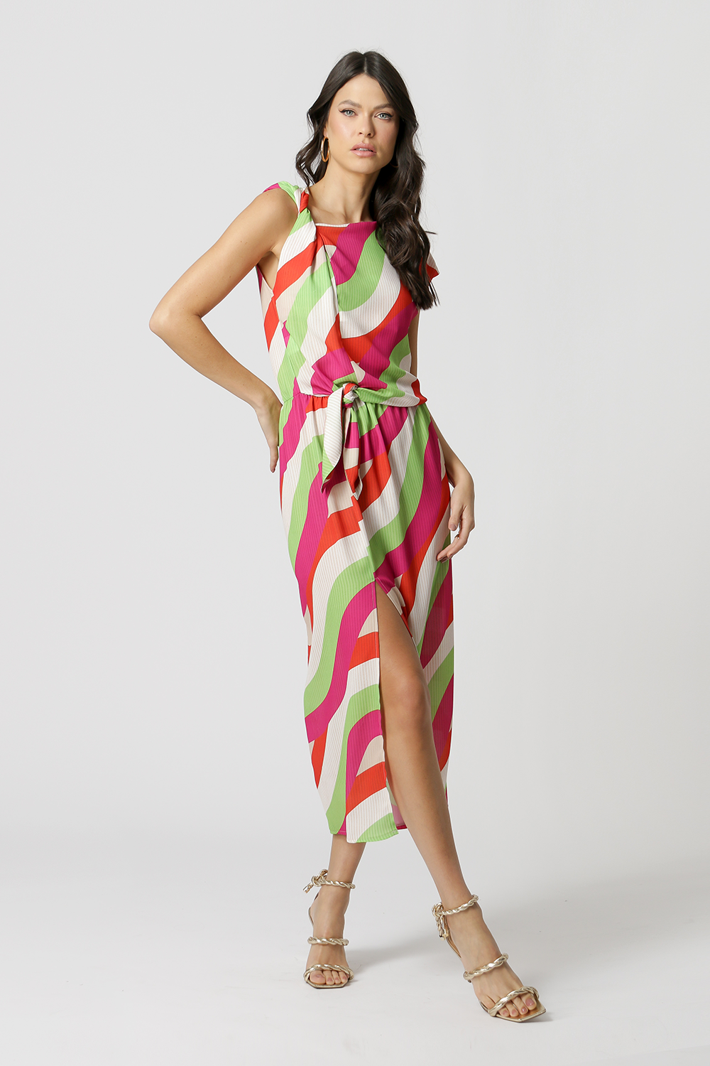 Vestido confeccionado en crepe fluido estampado, con un delicado giro en el tirante, realzando el escote. Lleva un falso lazo en la cintura, que moldea y realza la silueta, y una abertura en el bajo que deja la piel al descubierto. Viene con un forro de malla de color nude.