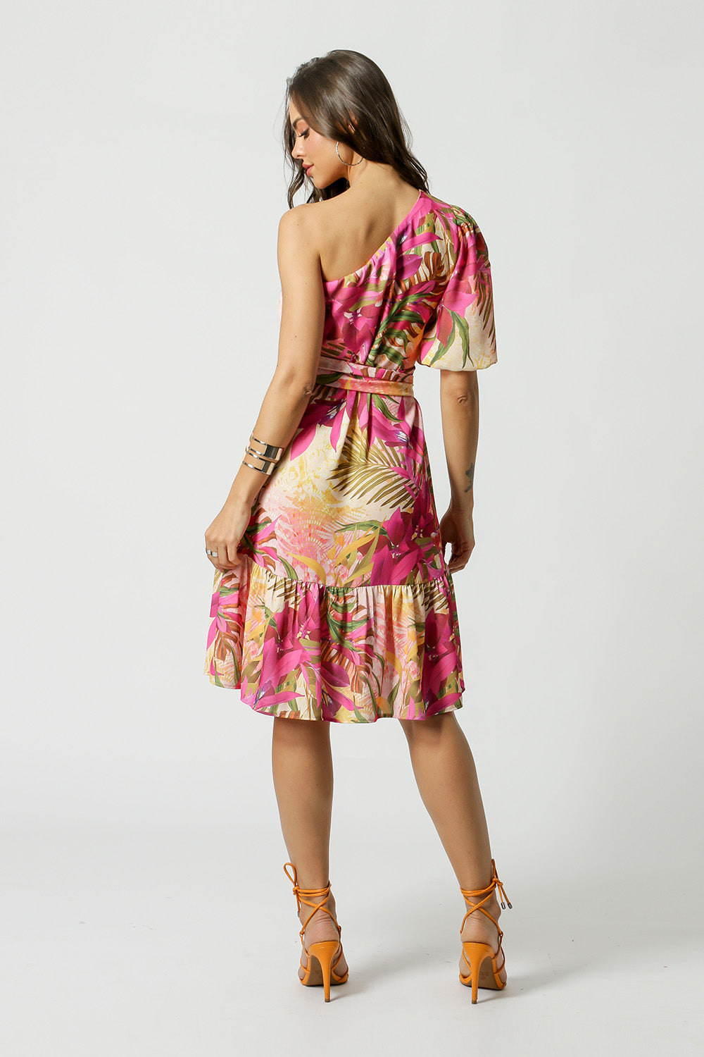 Vestido estampado de um ombro só com manga bufante.Confeccionada em crepe fluído em textura.Look casual perfeito para arrasar no verão.
