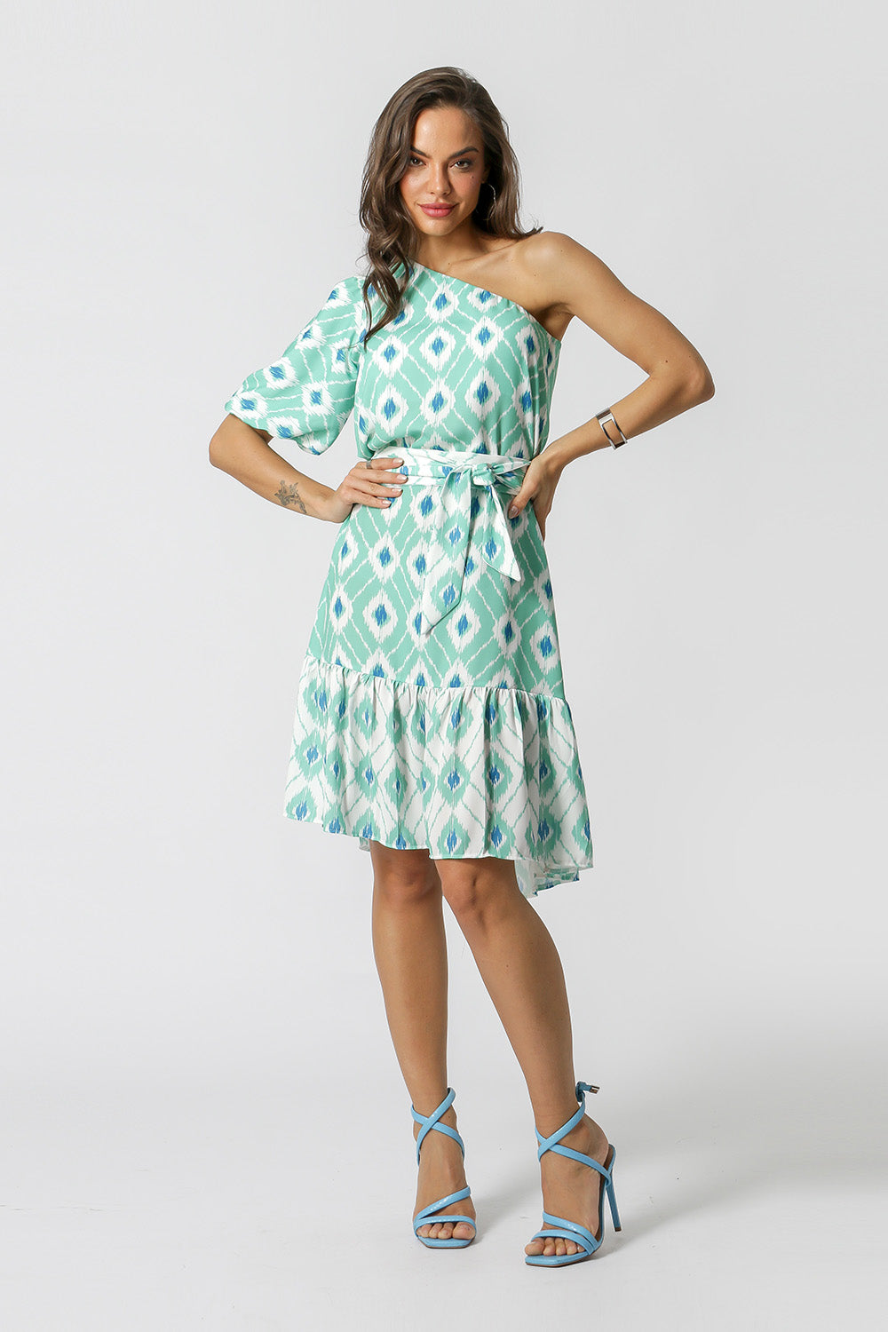 Vestido estampado de un solo hombro y mangas abullonadas. Realizado en crepe de textura fluida. Look casual perfecto para rockear este verano.