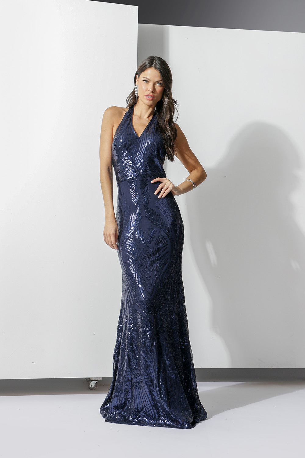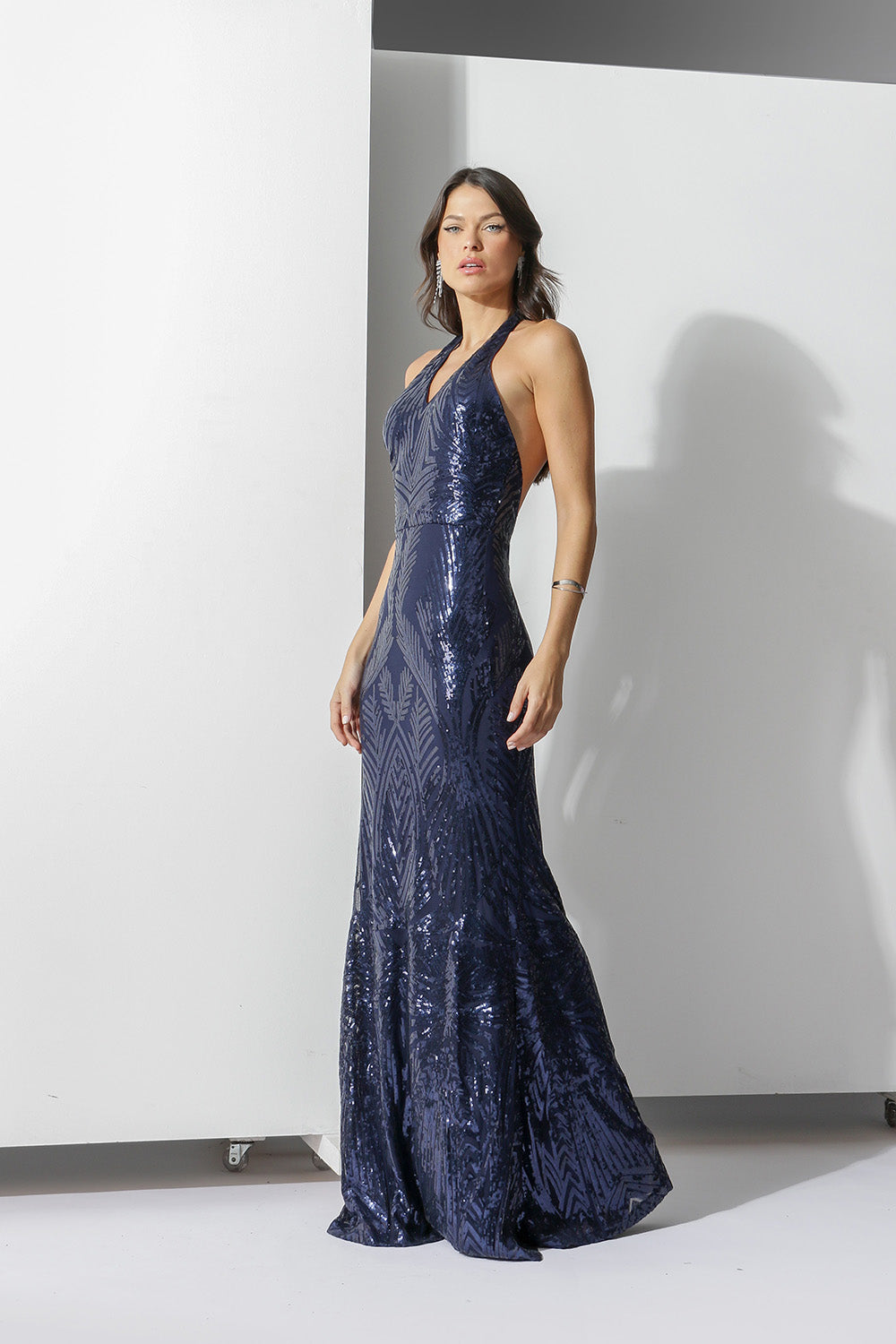 Vestido longo de festa com decote frente única, todo bordado e com forro.