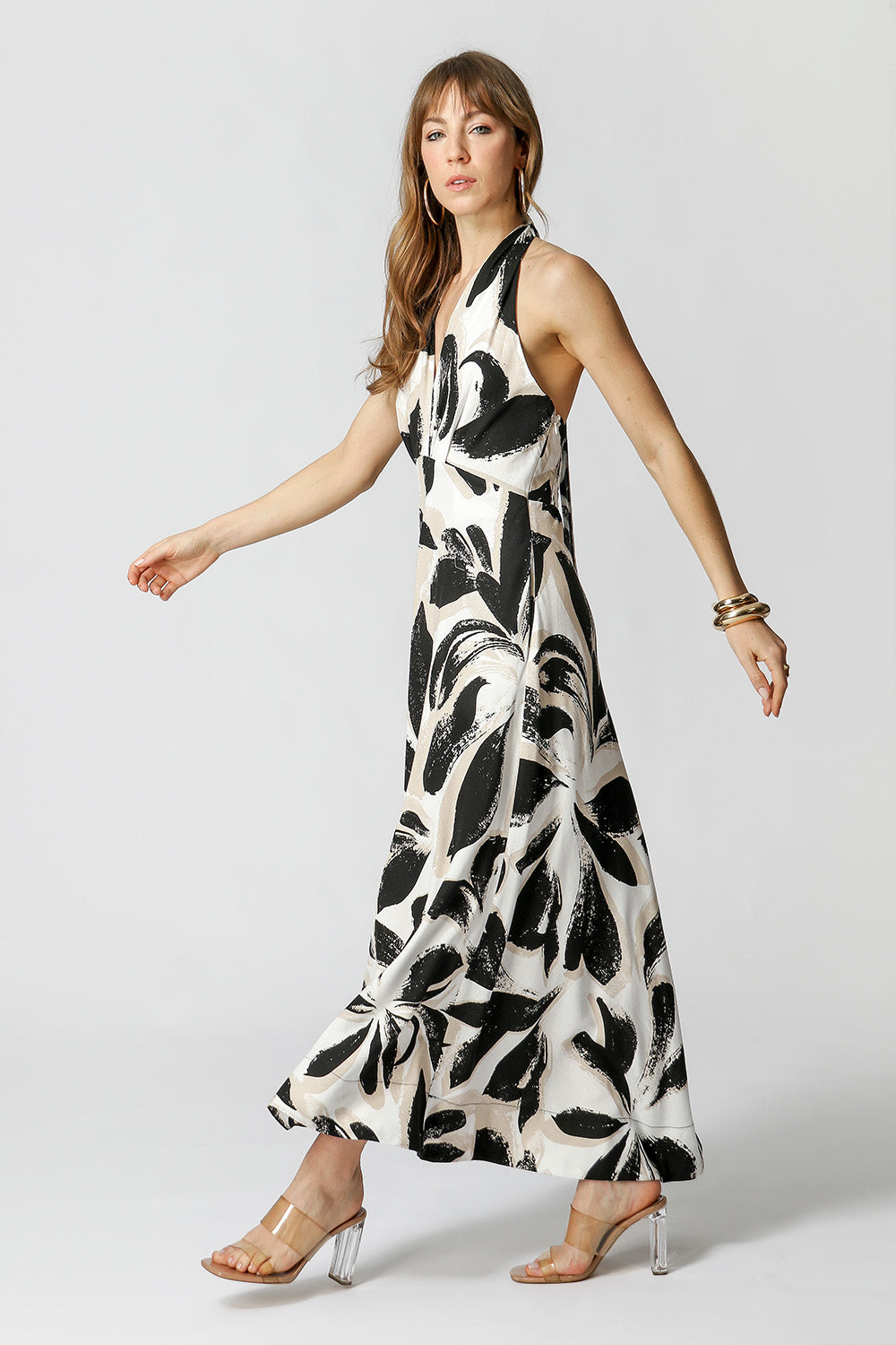 Vestido halter con escote cruzado. Modelo elegante para quienes disfrutan de los estampados exclusivos, ideal para looks casual.