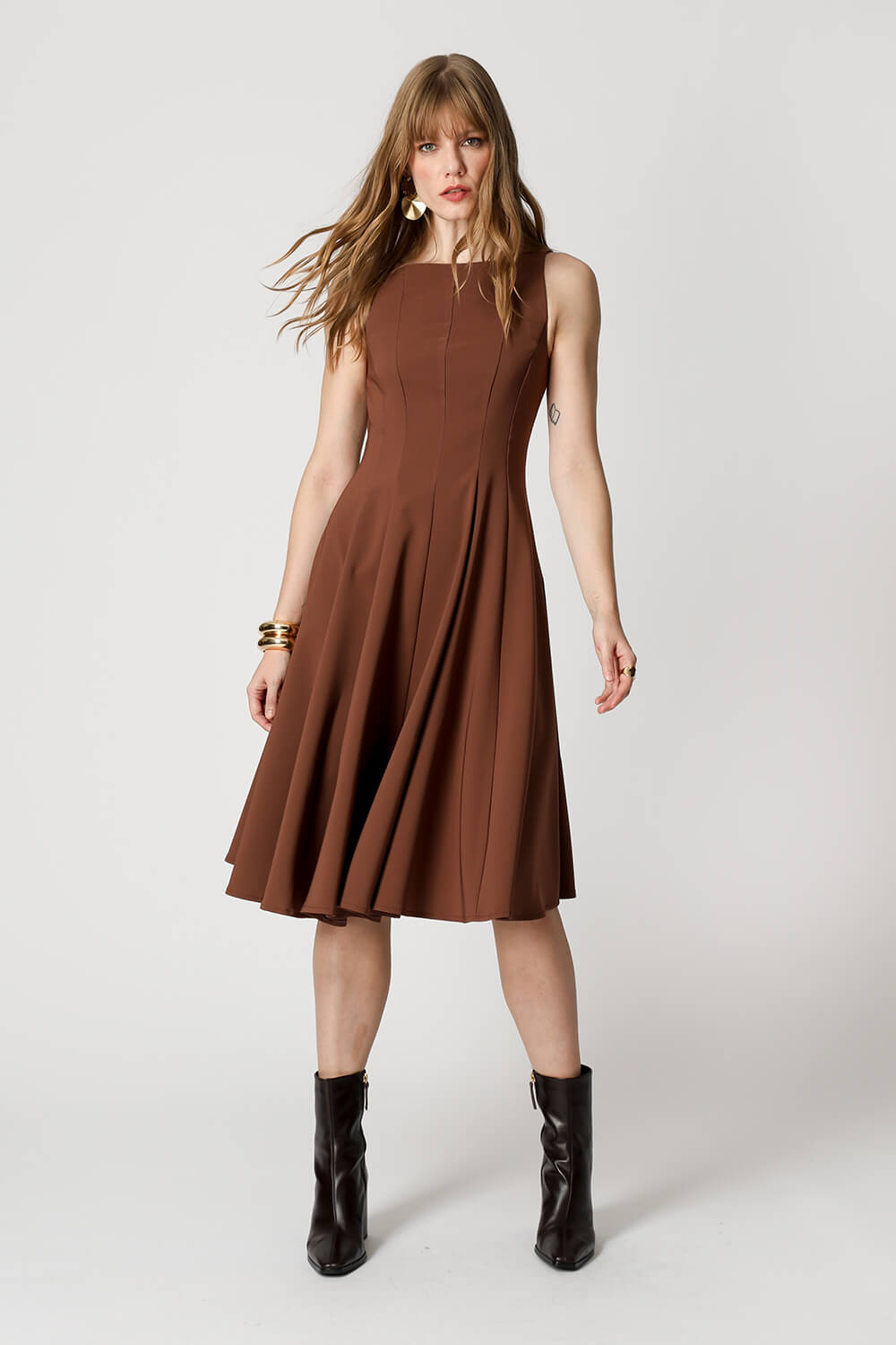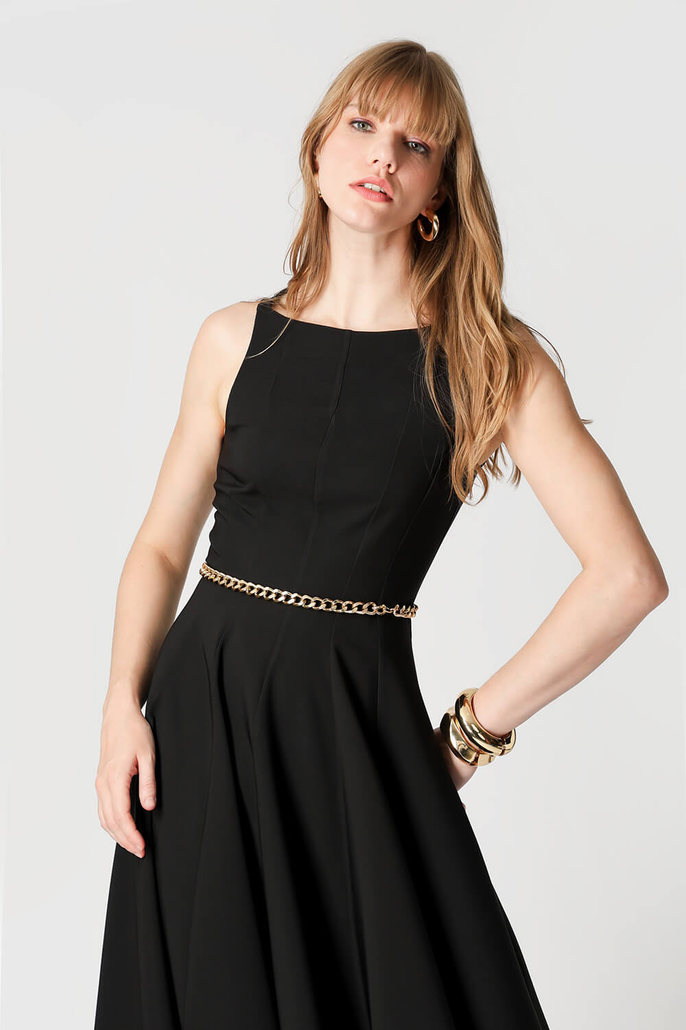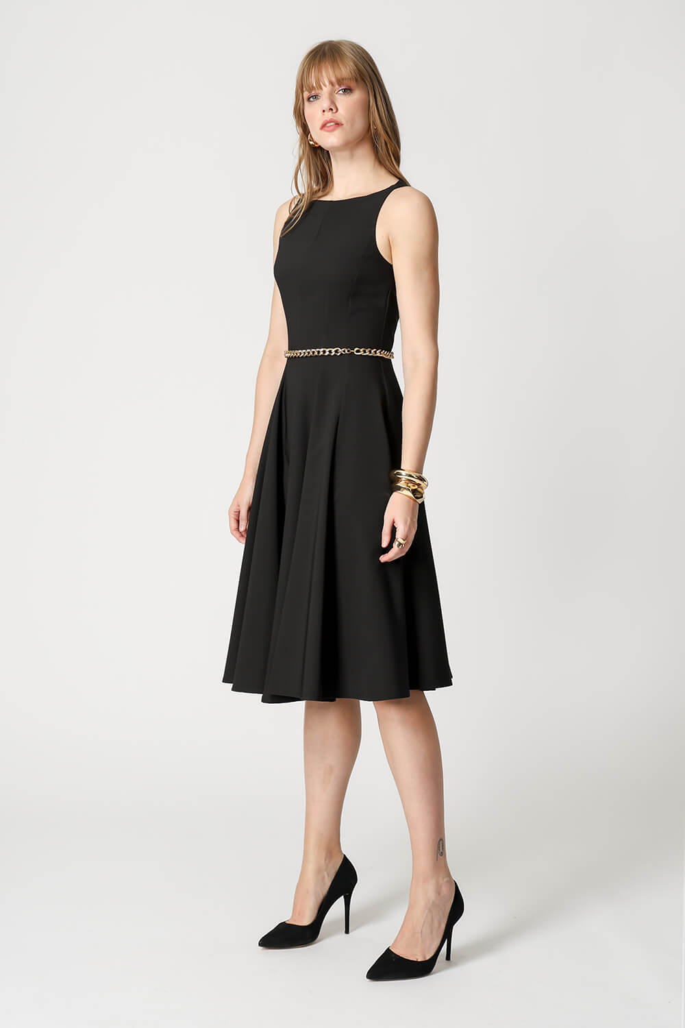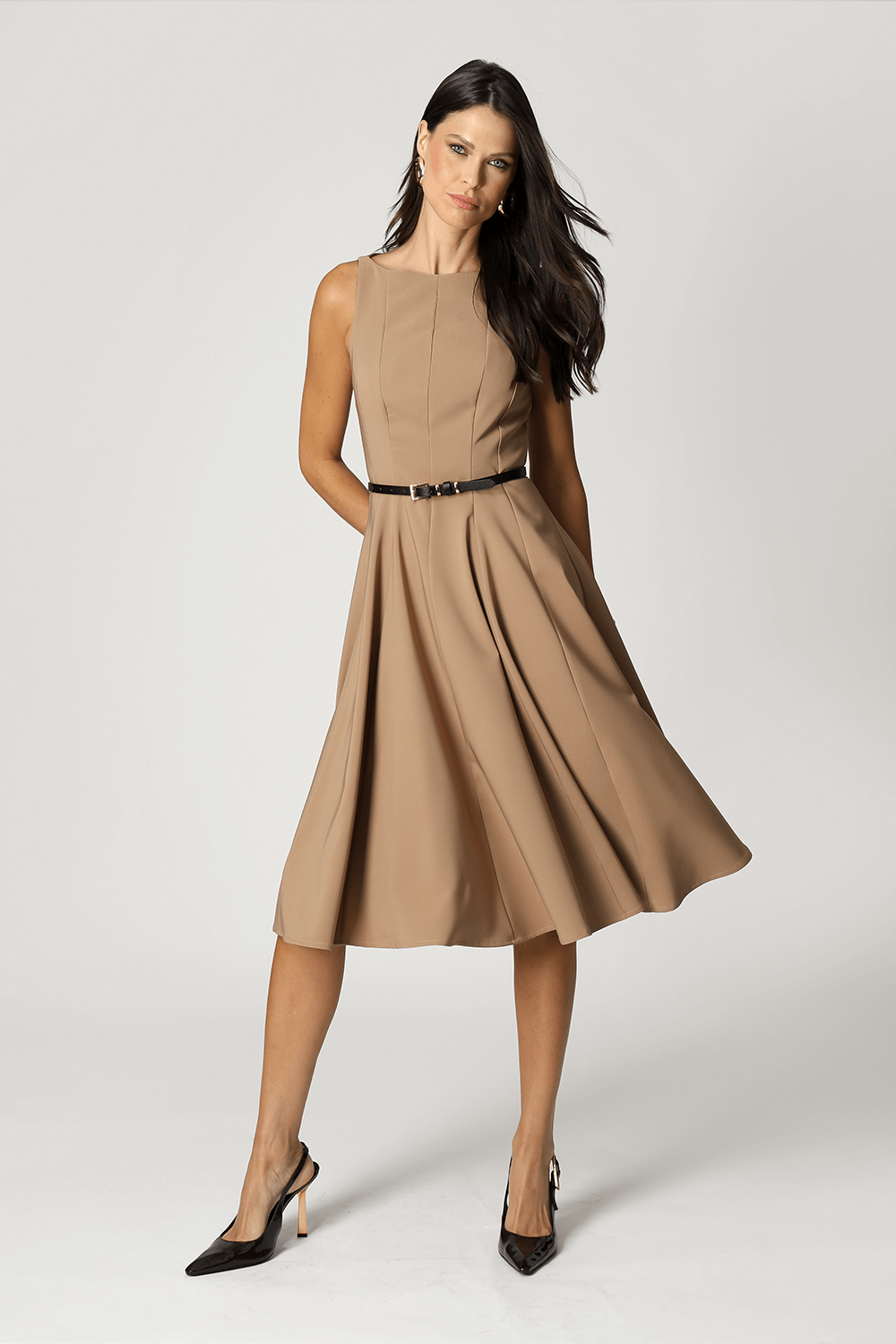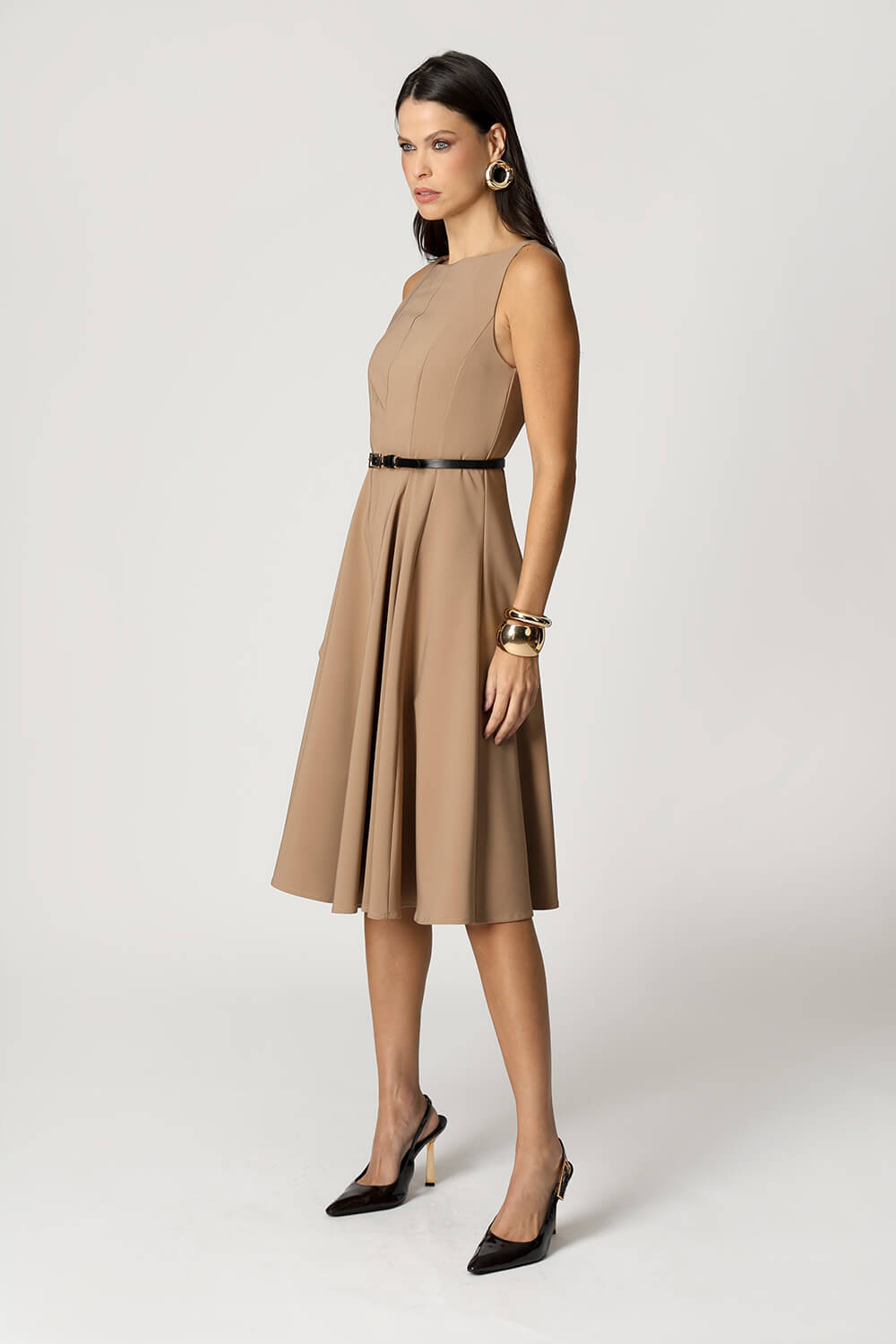 Vestido com modelagem godê e cintura marcada, confeccionado em tecido de alfaiataria que garante elegância e ótimo caimento. Ideal para ocasiões que pedem um look sofisticado e feminino.