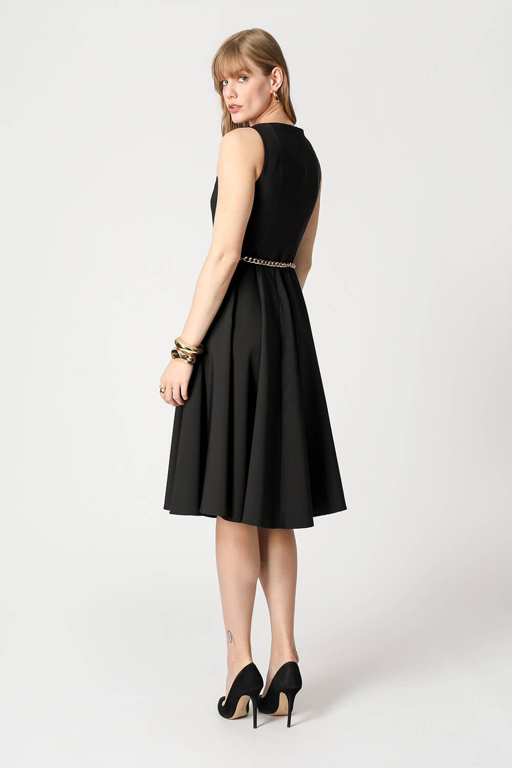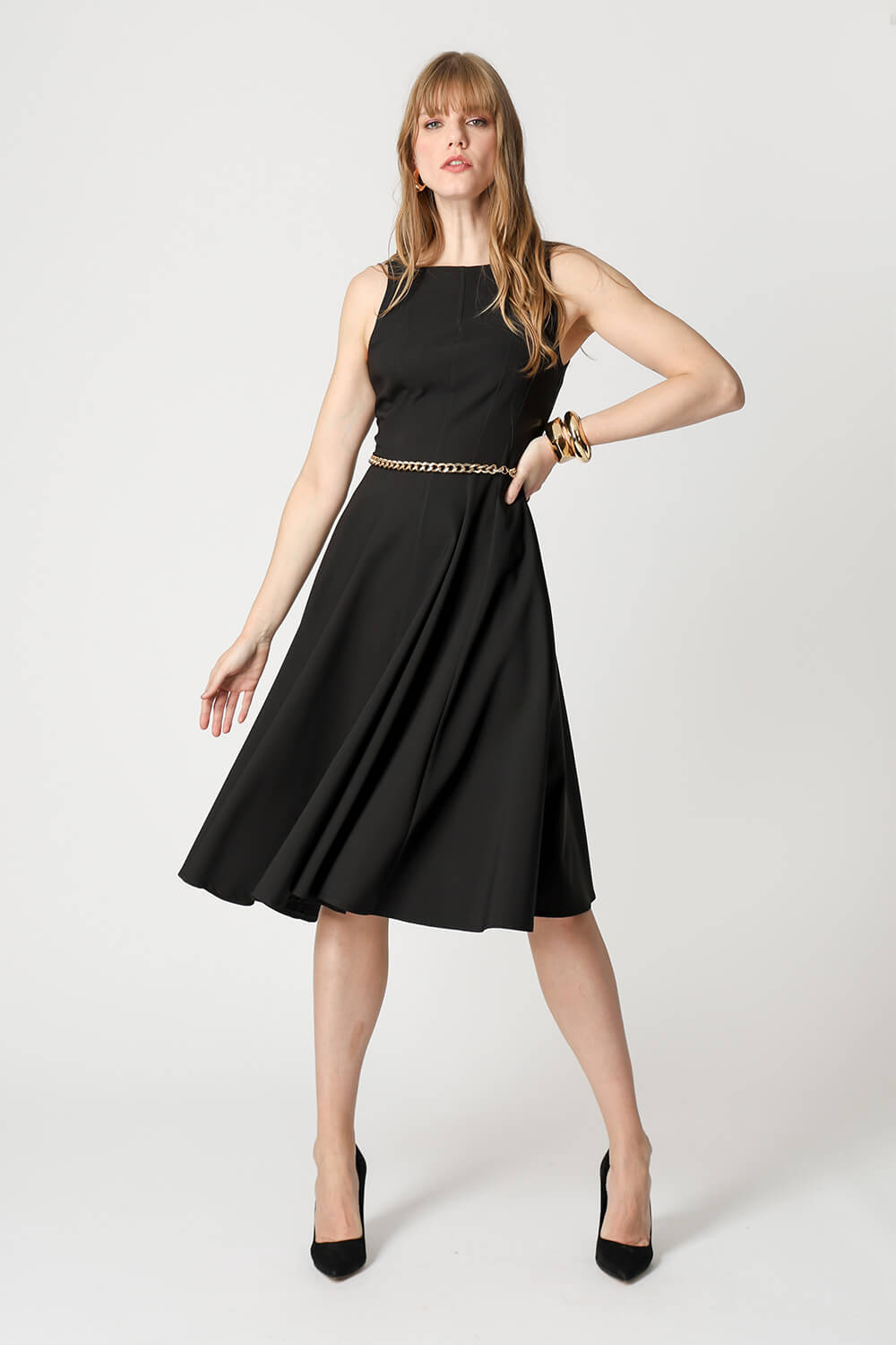 Vestido com modelagem godê e cintura marcada, confeccionado em tecido de alfaiataria que garante elegância e ótimo caimento. Ideal para ocasiões que pedem um look sofisticado e feminino.