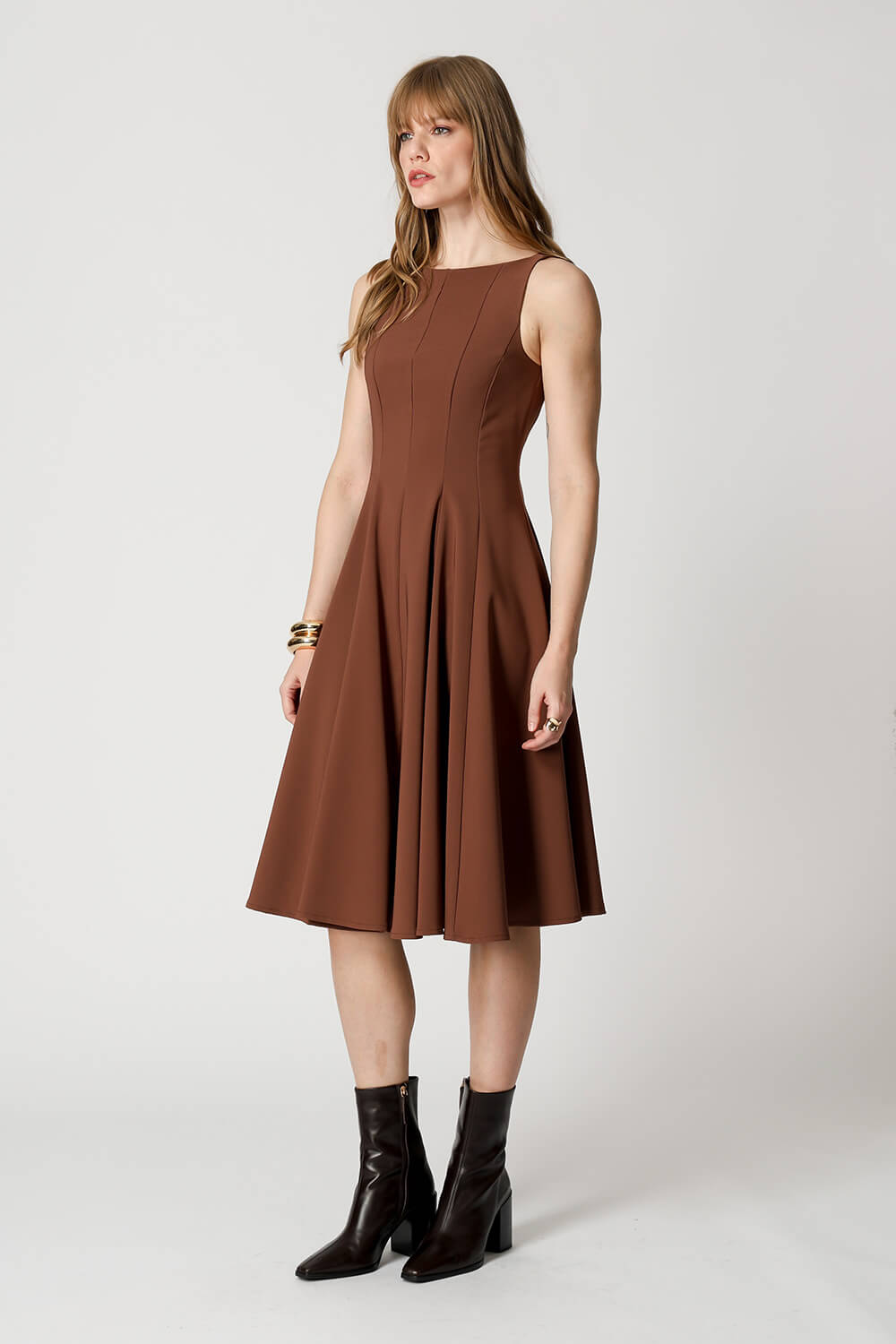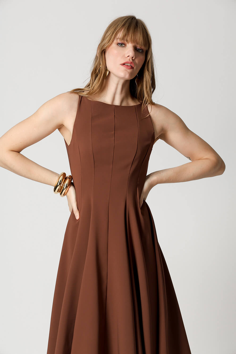 Vestido com modelagem godê e cintura marcada, confeccionado em tecido de alfaiataria que garante elegância e ótimo caimento. Ideal para ocasiões que pedem um look sofisticado e feminino.