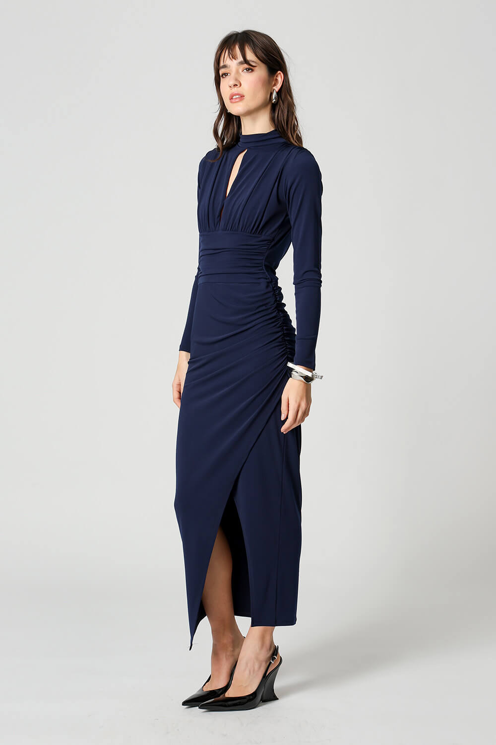 Vestido em malha ITY com gola alta, abertura frontal e costas abertas. Modelo sofisticado com ombreiras marcantes e fenda na barra, ideal para looks elegantes e ousados.