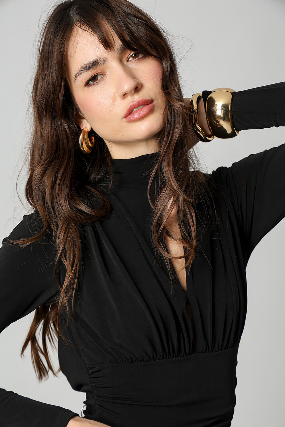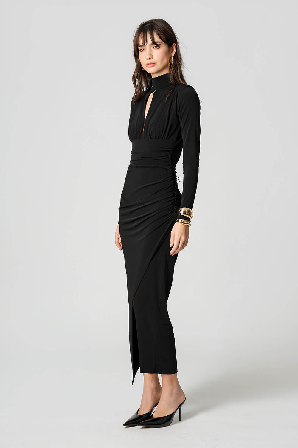 Vestido em malha ITY com gola alta, abertura frontal e costas abertas. Modelo sofisticado com ombreiras marcantes e fenda na barra, ideal para looks elegantes e ousados.