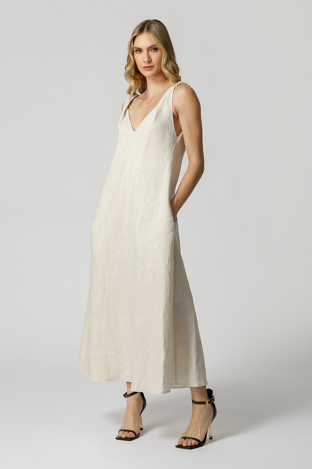 Vestido com alça torcida, decote V trazendo charme para um look casual, aposte!