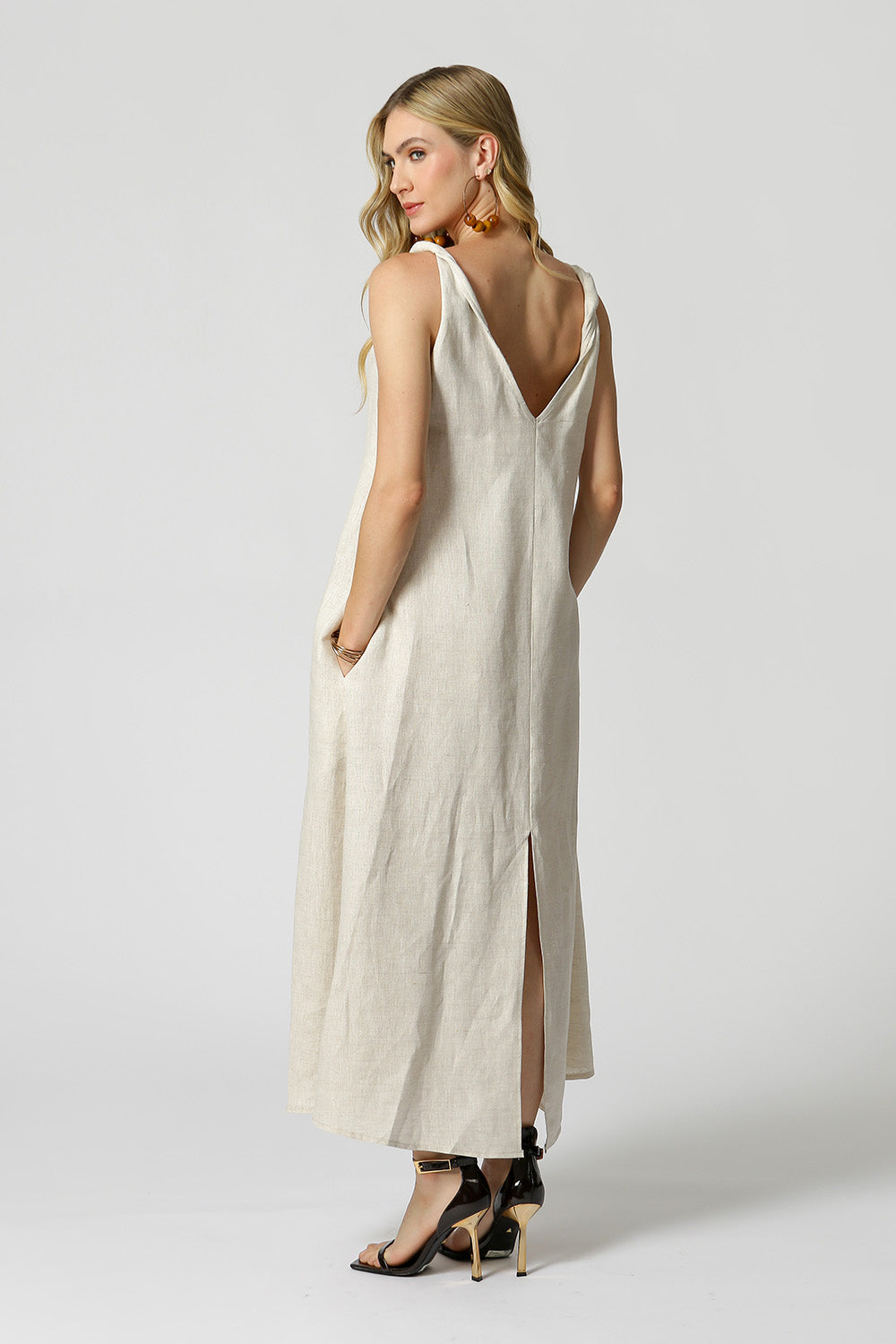 Possui alças torcidas e abertura na parte de trás e bolsos laterais