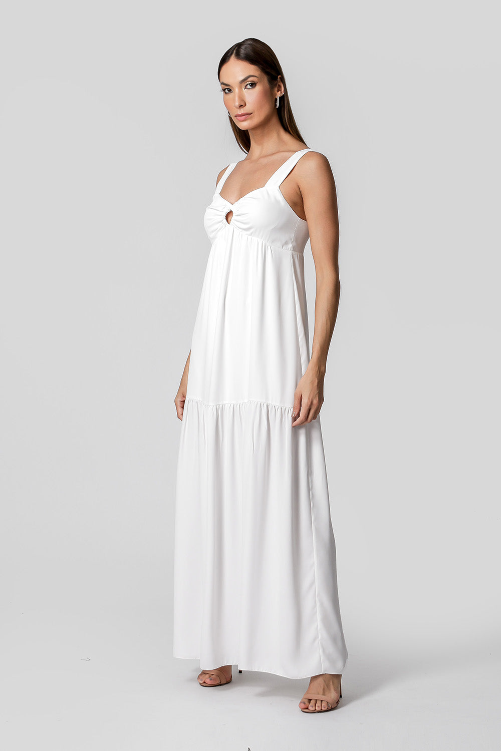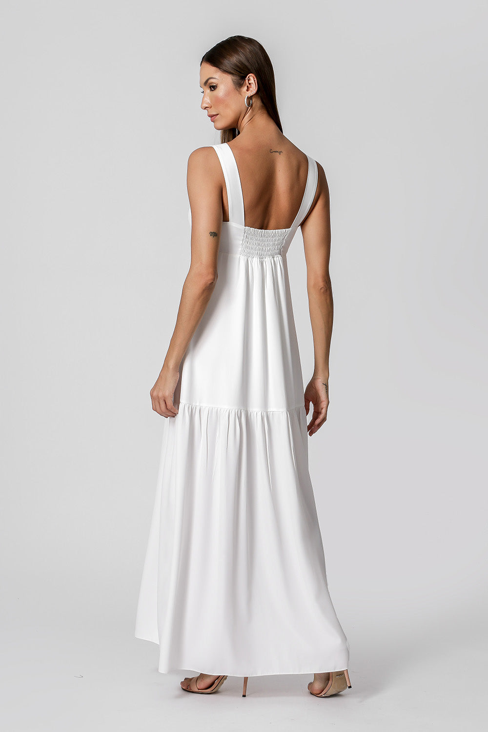 Vestido largo de silueta ligeramente holgada, tirantes anchos y detalle calado en el busto. ¡Úsalo en un look de verano y luce espectacular!