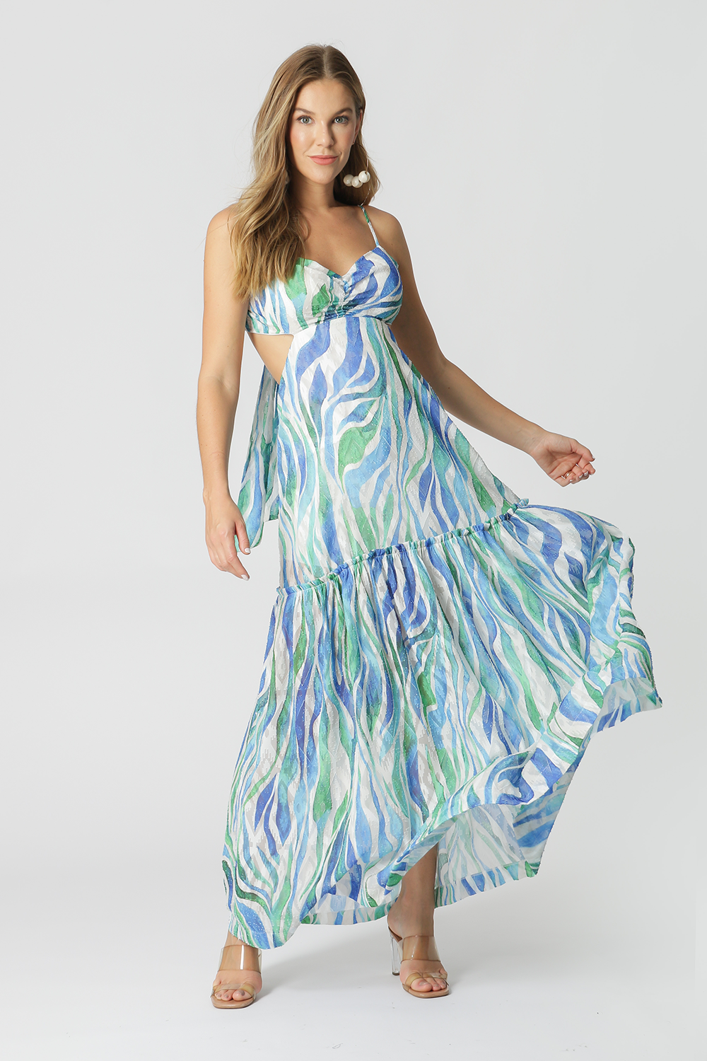 Vestido largo con tirantes ajustables, detalle calado en el lateral, lazo en la espalda con cintura elástica y copas forradas. Fabricado en tejido de gasa estampado. Pieza fresca y de moda, perfecta para el verano.