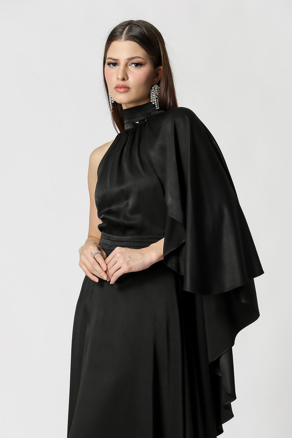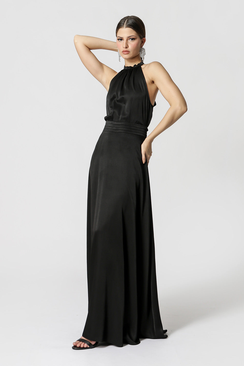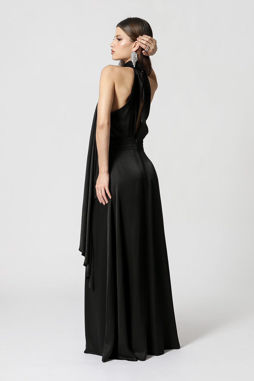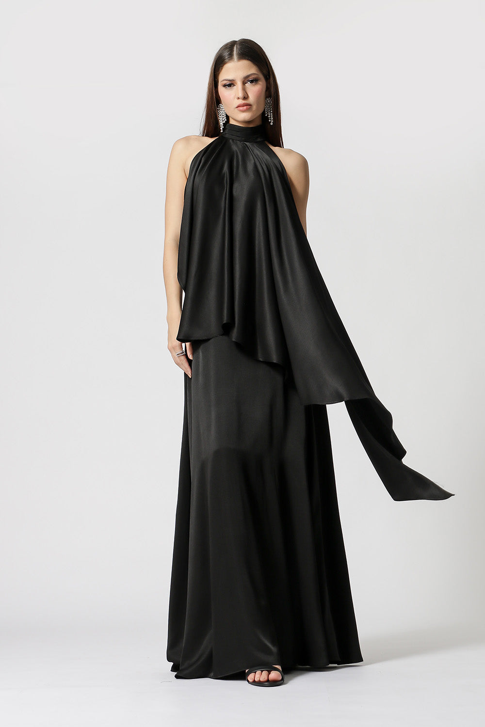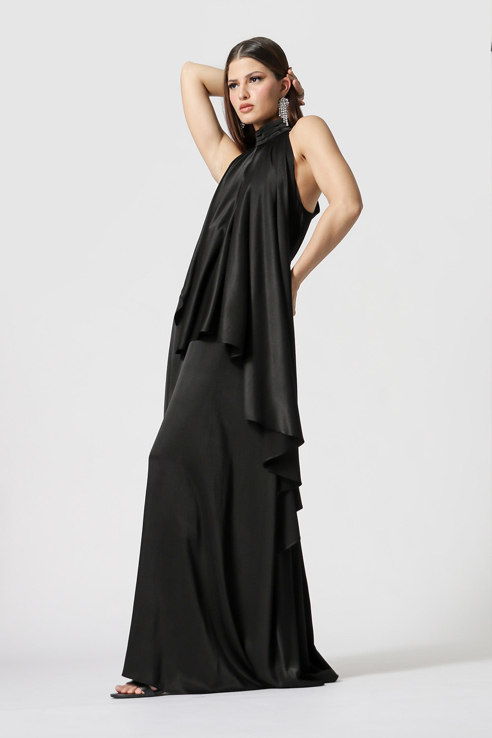 Vestido largo capa asimétrico con detalles plisados en la cintura y botones en la parte delantera y trasera. Un modelo realizado en tejido Satén con ligera caída. Aportando además elegancia y diferentes formas de uso para un ambiente nocturno sofisticado y diferente.