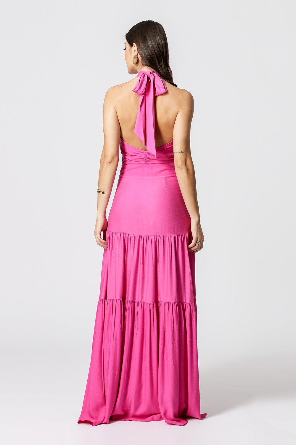 Vestido largo con marías, con escote cruzado y un solo tirante, viene con un fajín opcional y un collar de metal único, que puede usarse para un look casual, o incluso para un look de noche.