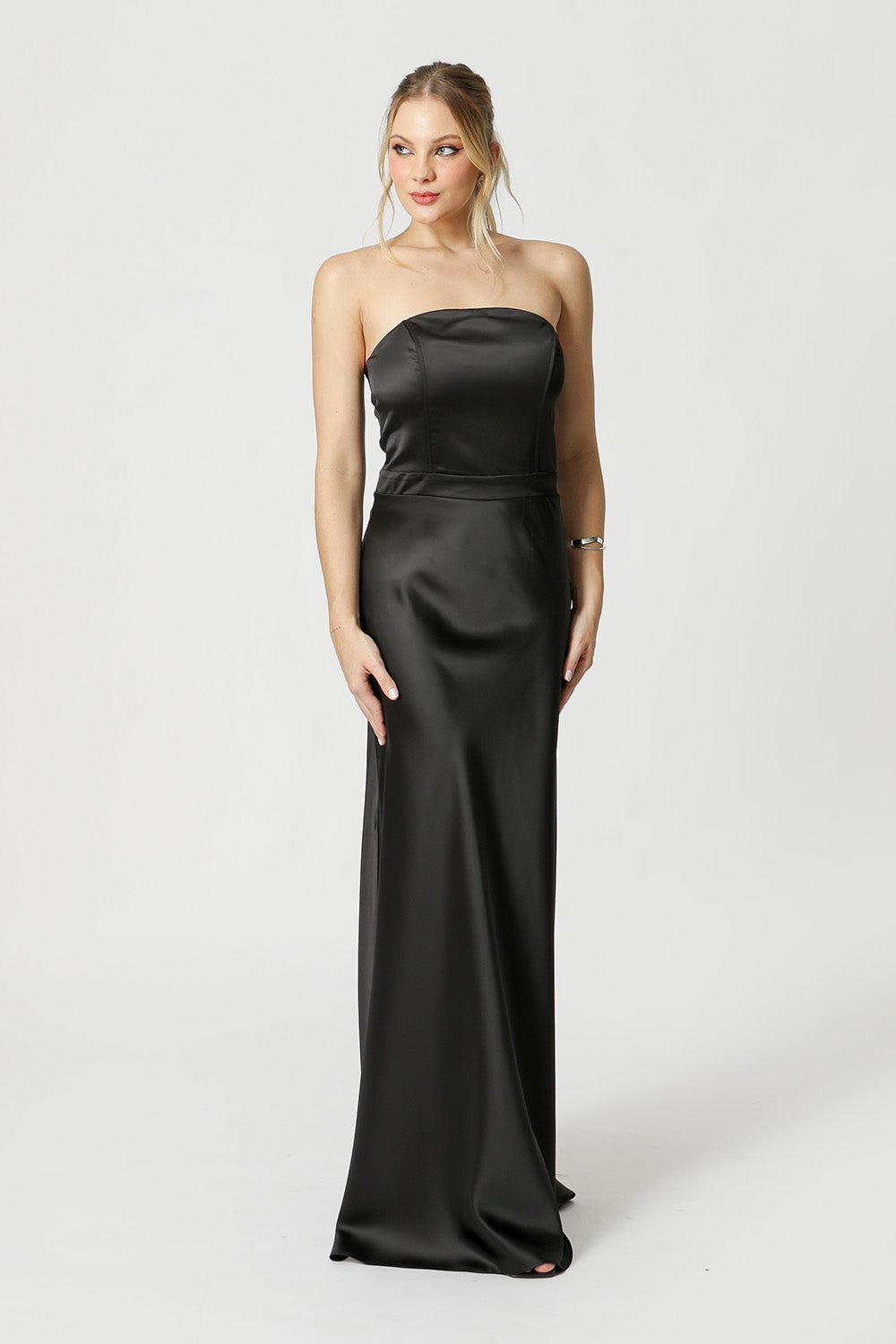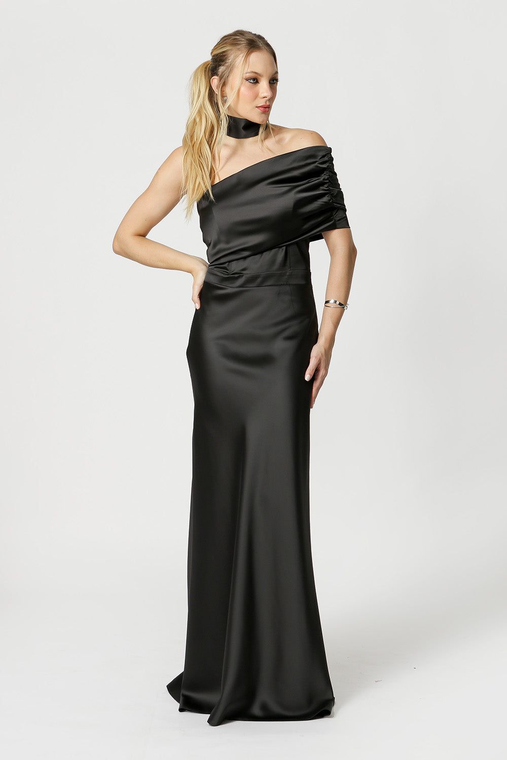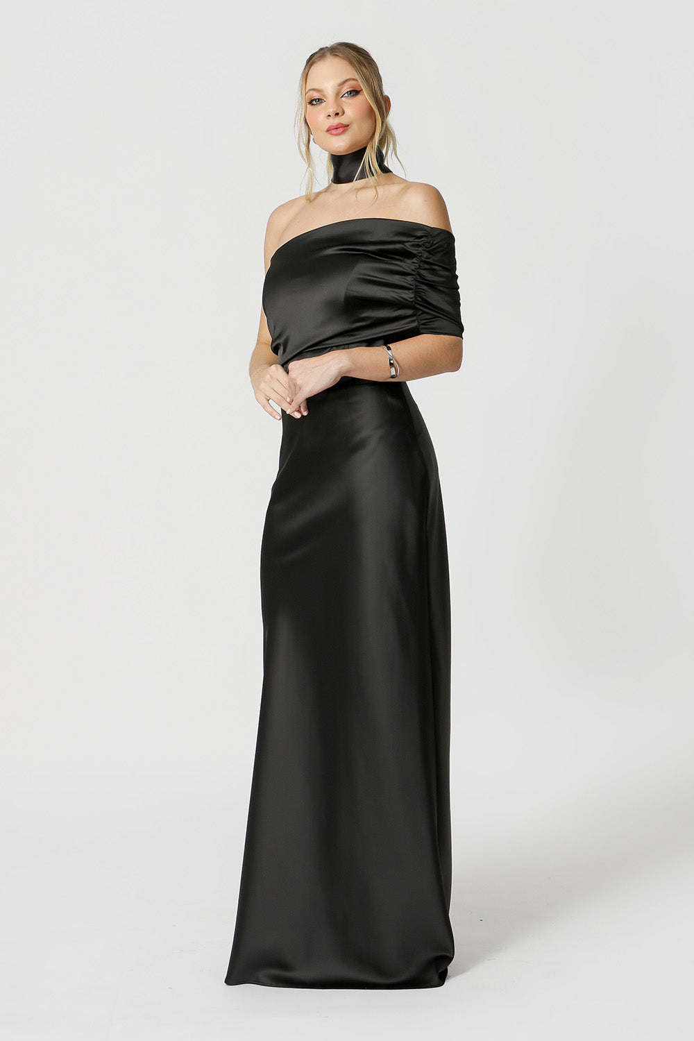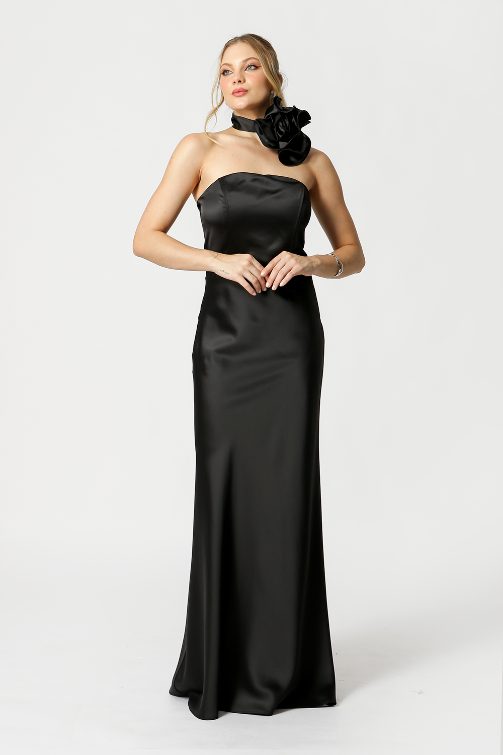 Vestido largo con detalle de flores desmontables confeccionado en el propio tejido. Una pieza confeccionada con tejido de satén grueso. Modelo elegante y distintivo, gran opción para el ambiente nocturno.