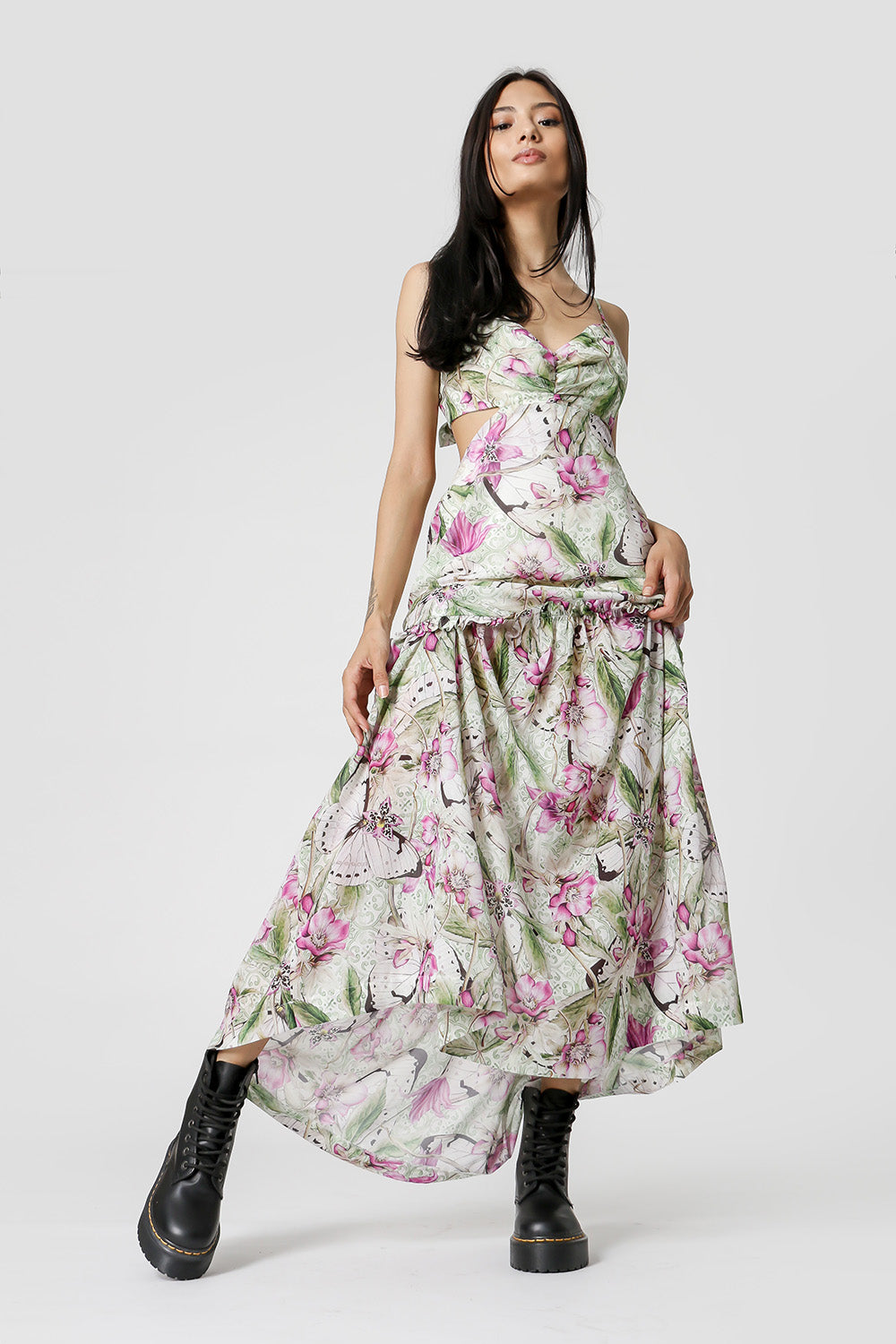 Vestido largo de voile estampado con lazo en la espalda. Tiene correa ajustable, cinturilla elástica, copas y forro. Pieza fresca y de moda, perfecta para el verano.