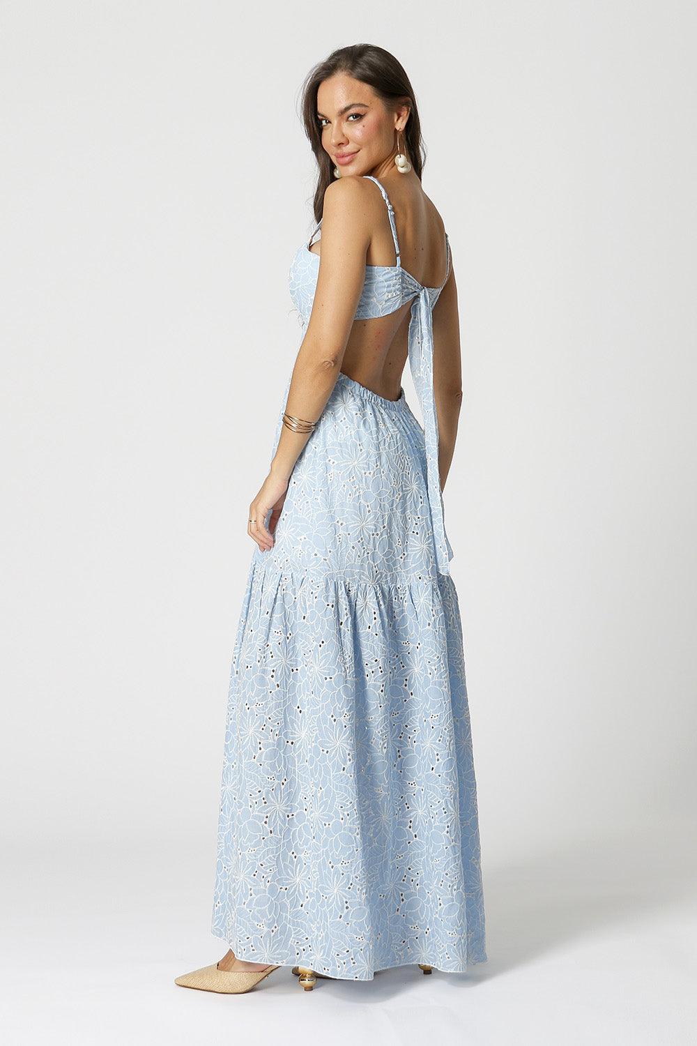 Vestido largo de capas confeccionado en laise bordada. Tiene detalle de apertura y lazo en la espalda. ¡Vestido ideal para el verano!
