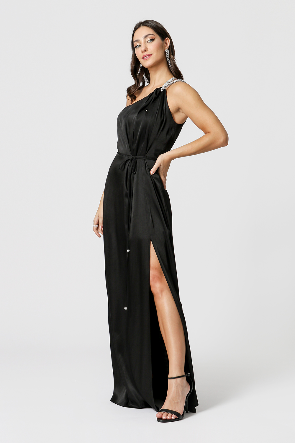 Vestido largo de un solo hombro con detalle de pedrería. Fabricado en satén. Modelo elegante y potente, perfecto para un look de noche.