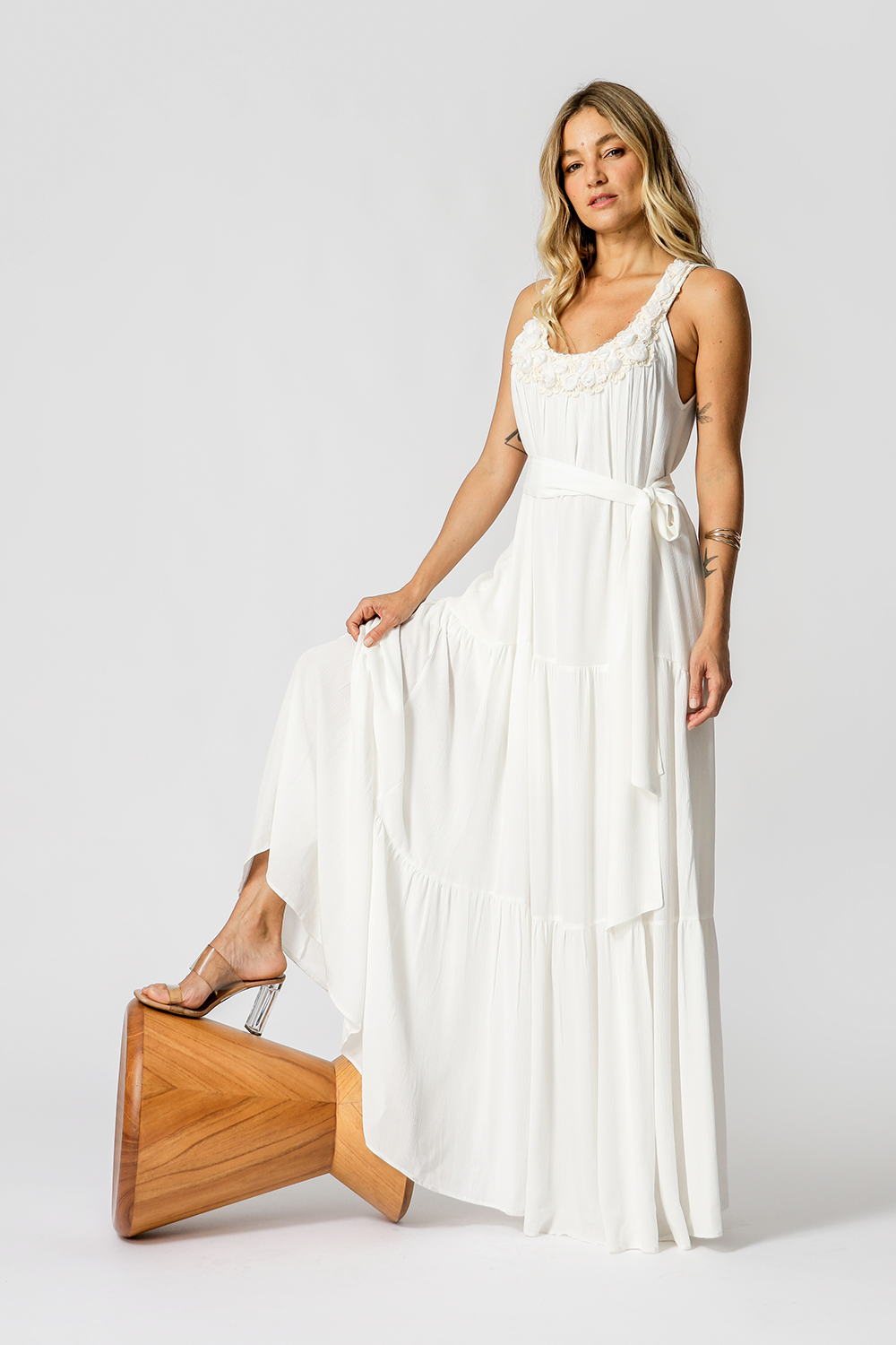 Vestido largo sin mangas, fajín del mismo tejido y detalles de encaje floral en el escote. Fabricado en tejido fluido de textura ligera. Un modelo de corte holgado y ligero, perfecto para llevar en días calurosos.