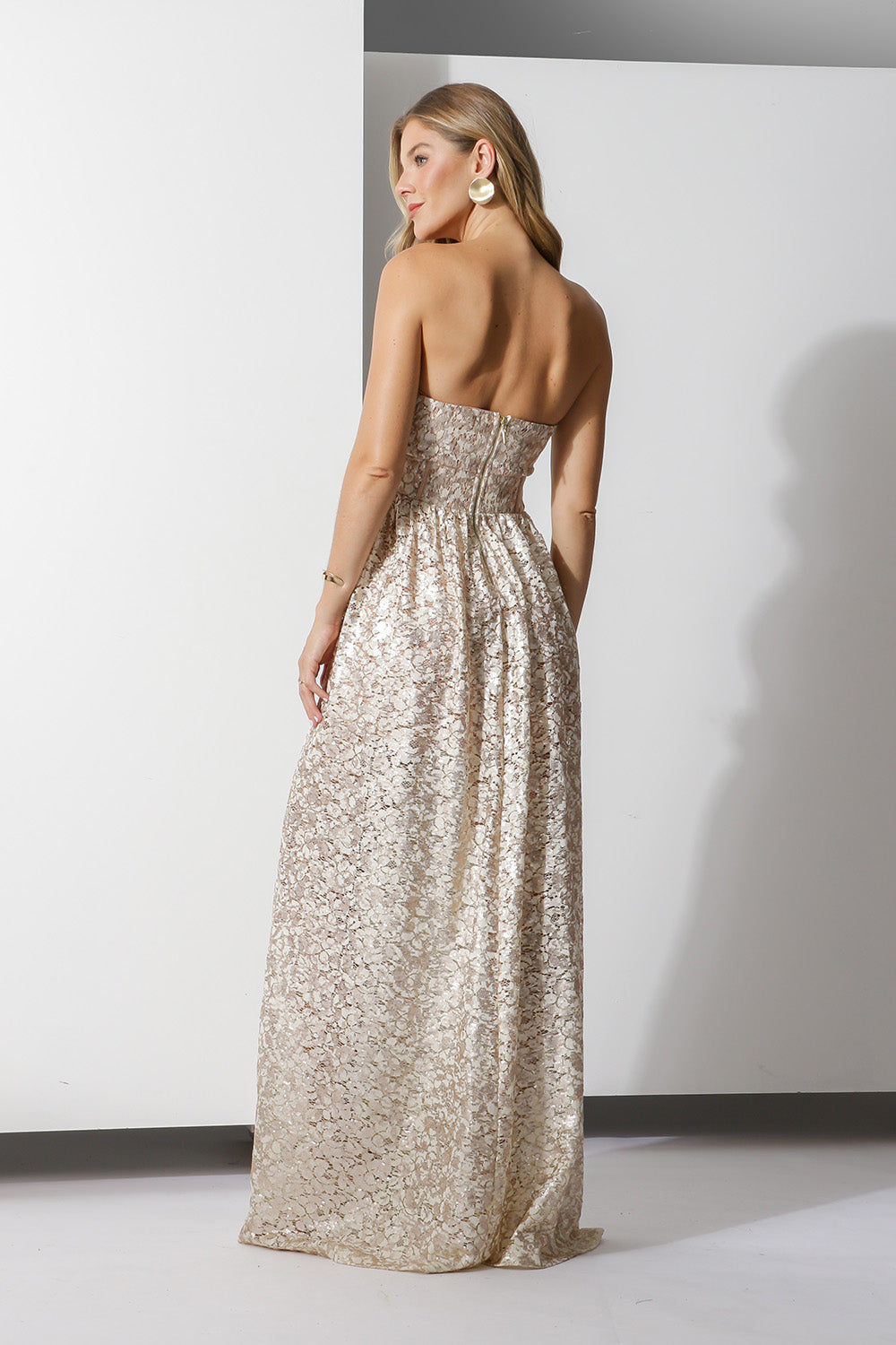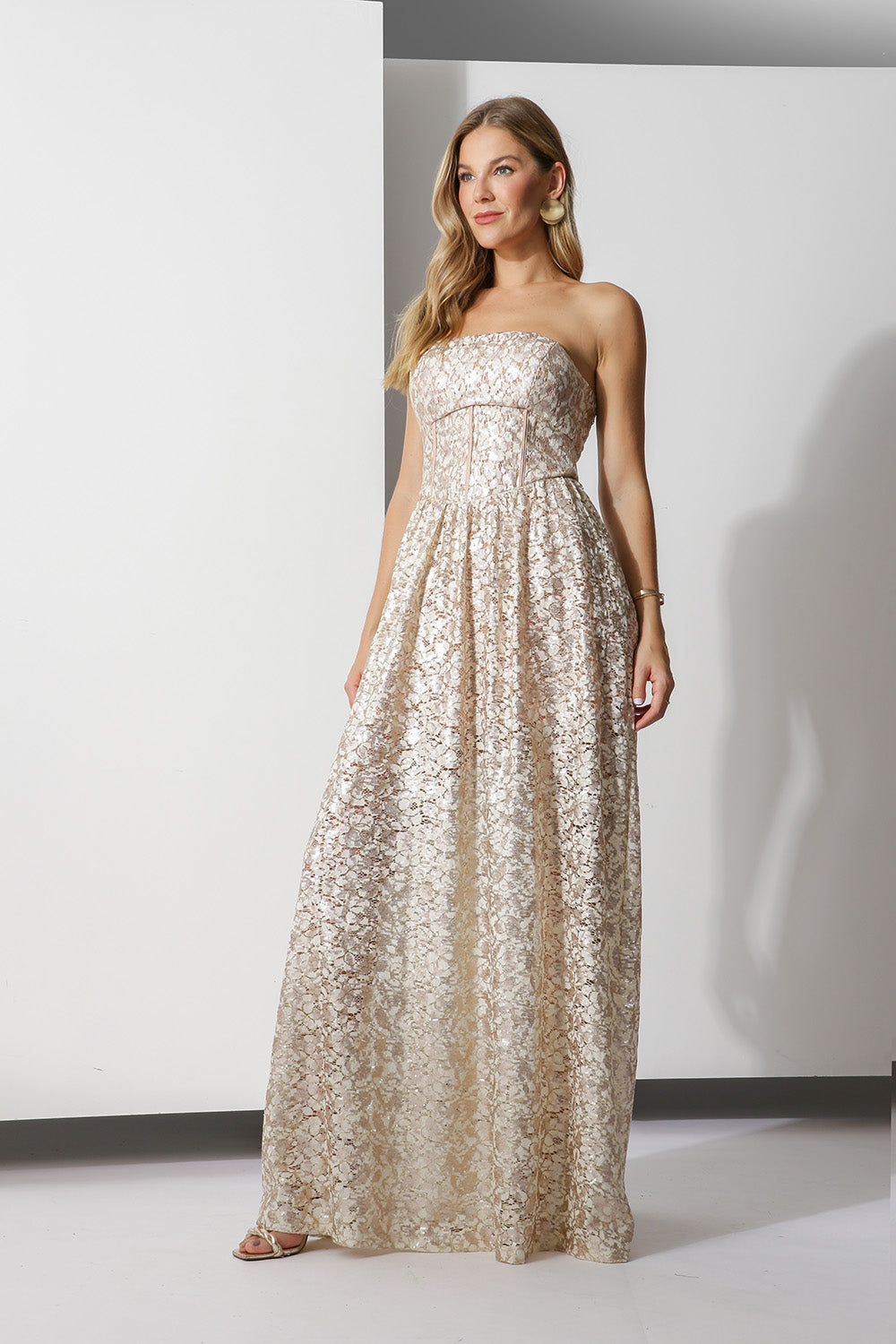 Vestido largo sin tirantes. Pieza confeccionada en tejido de encaje con forro a juego. Un modelo elegante y potente, perfecto para salir por la noche.