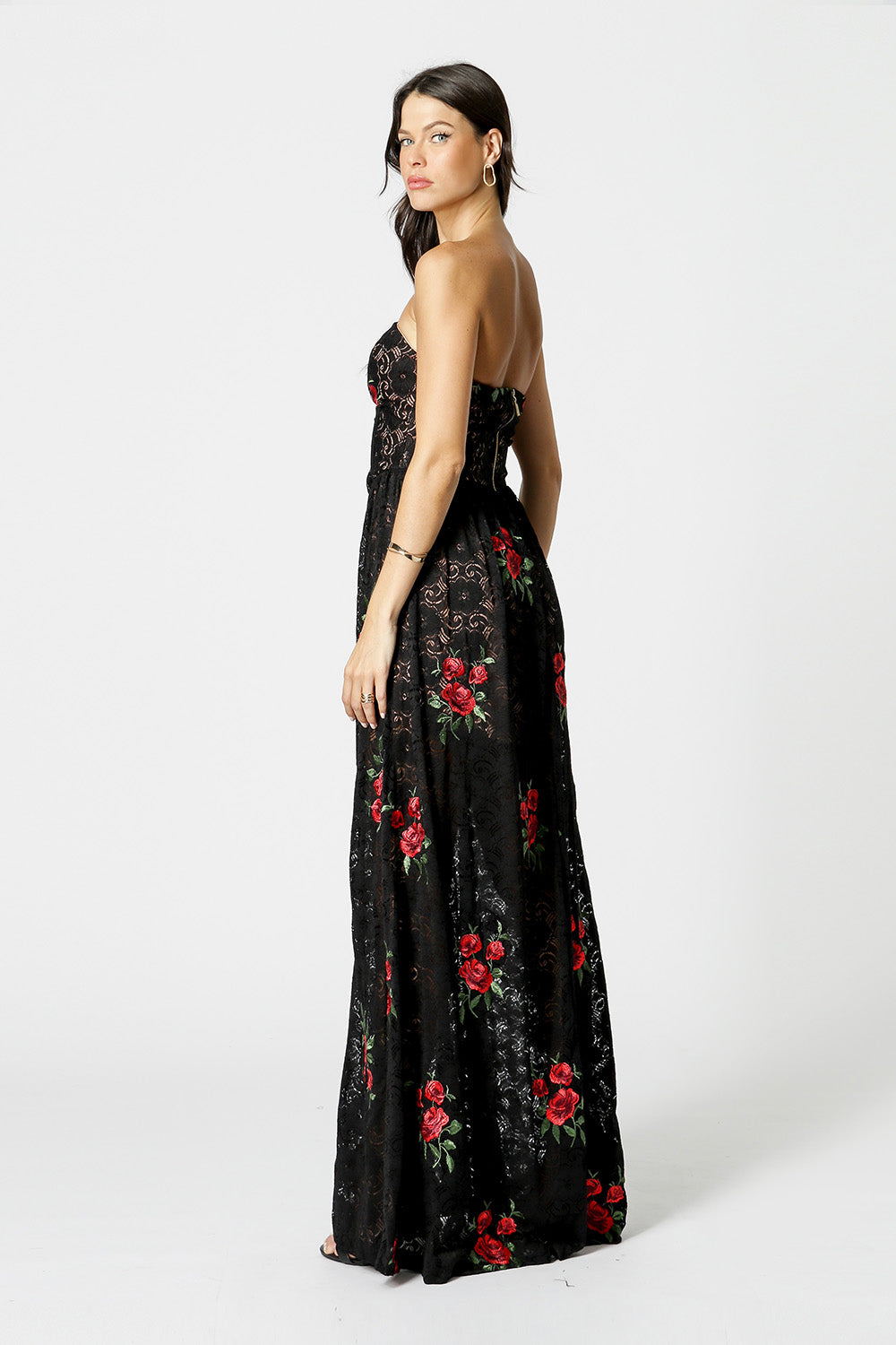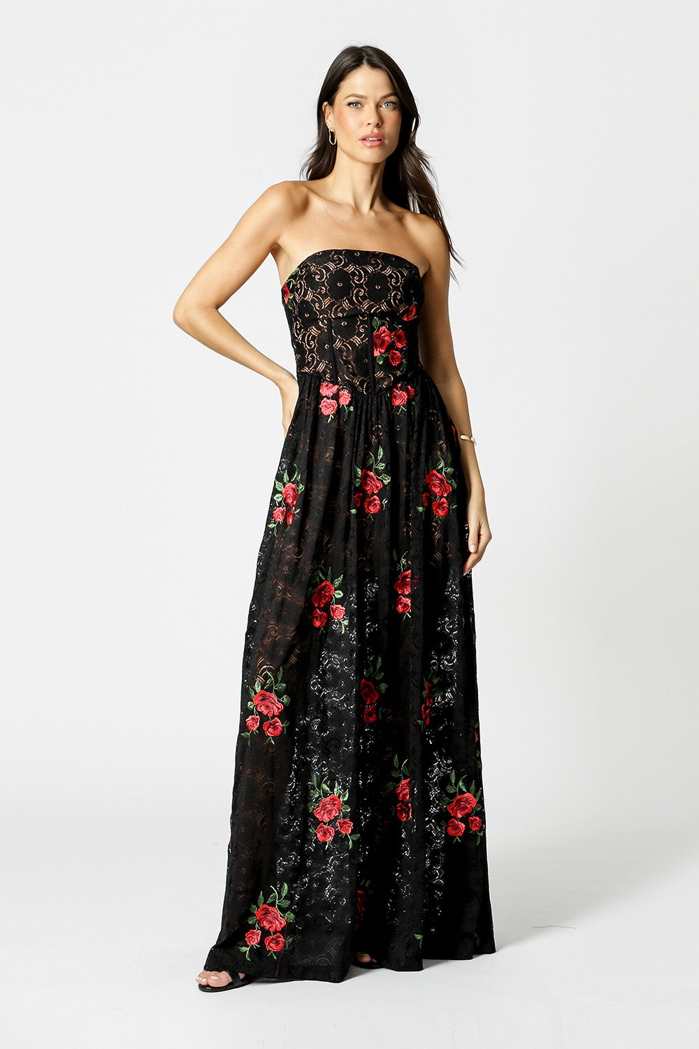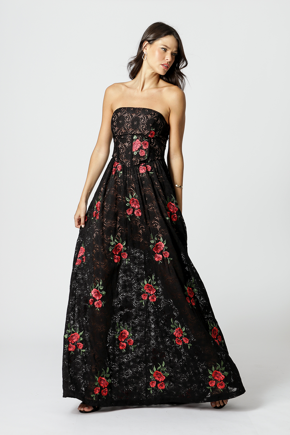 Vestido largo sin tirantes. Pieza confeccionada en tejido de encaje con forro a juego. Un modelo elegante y potente, perfecto para salir por la noche.