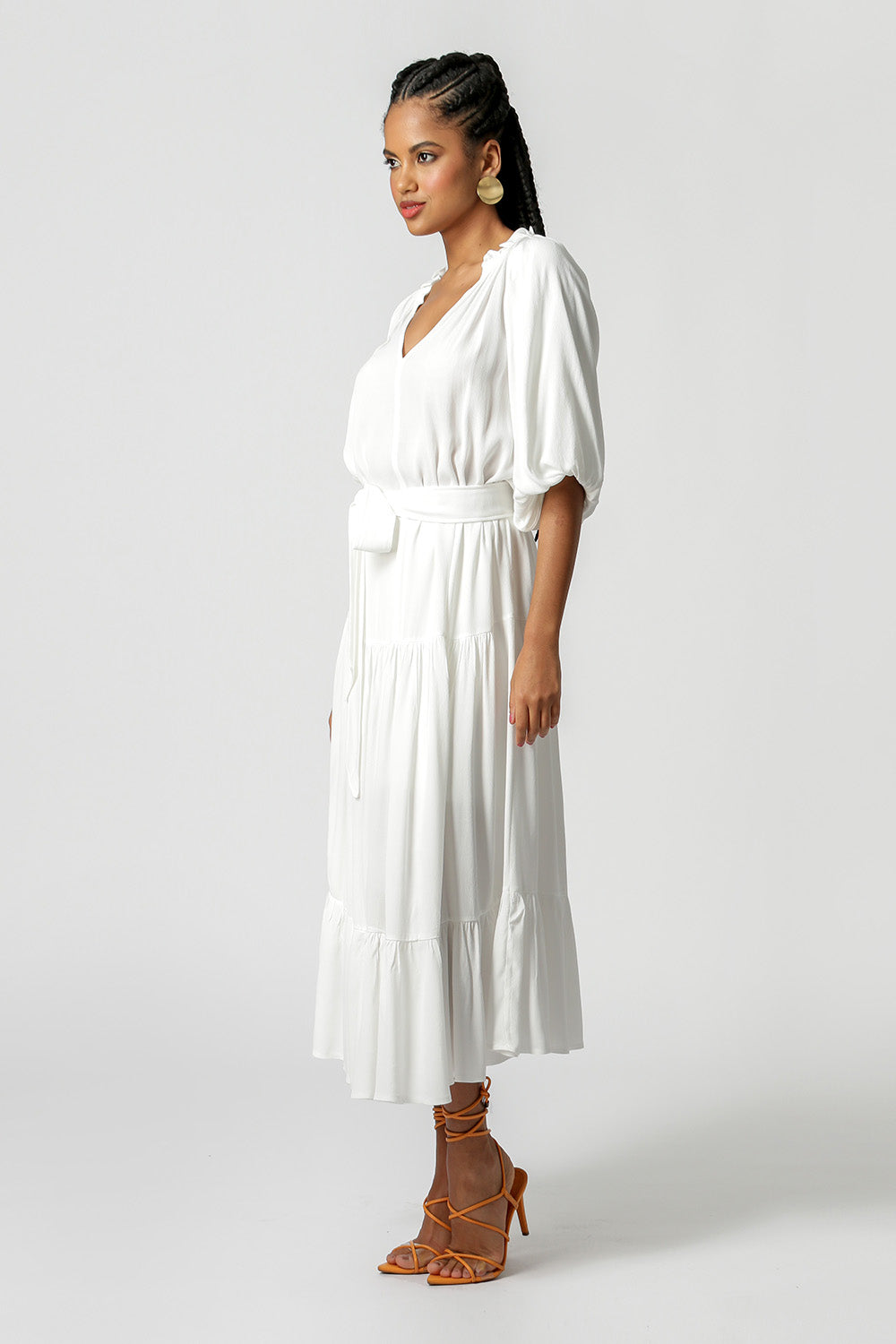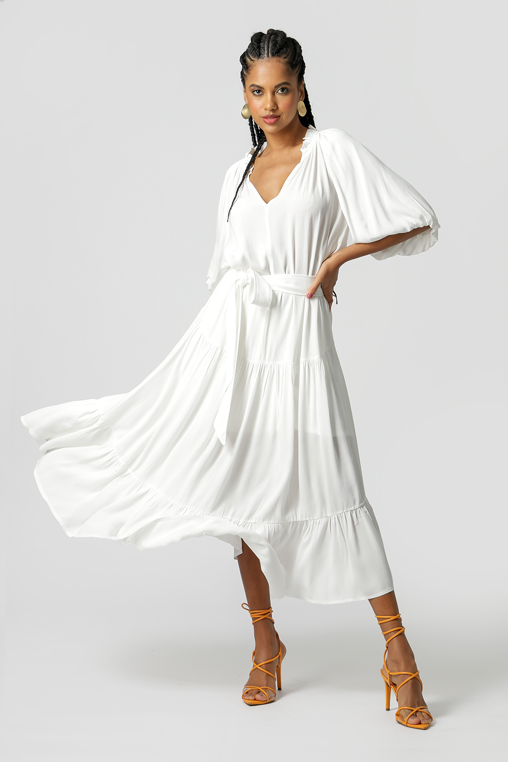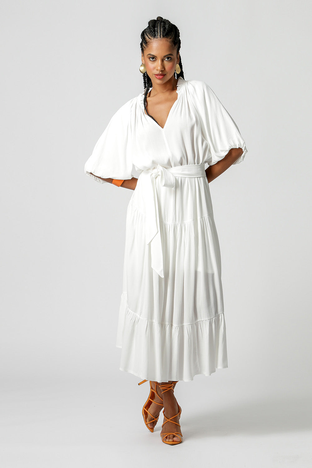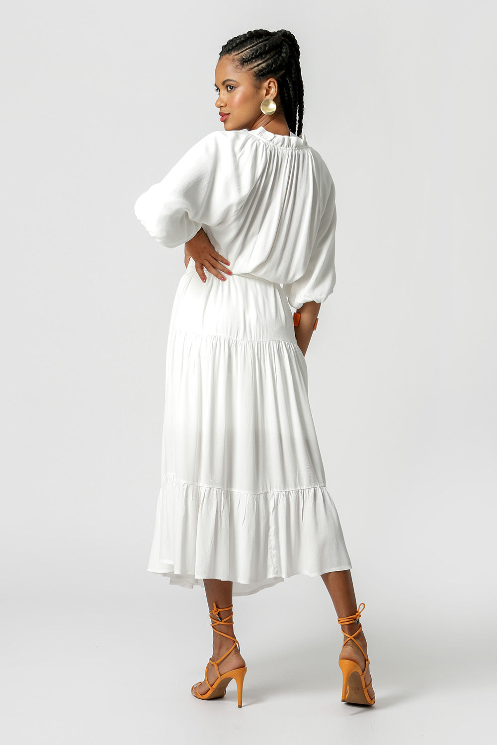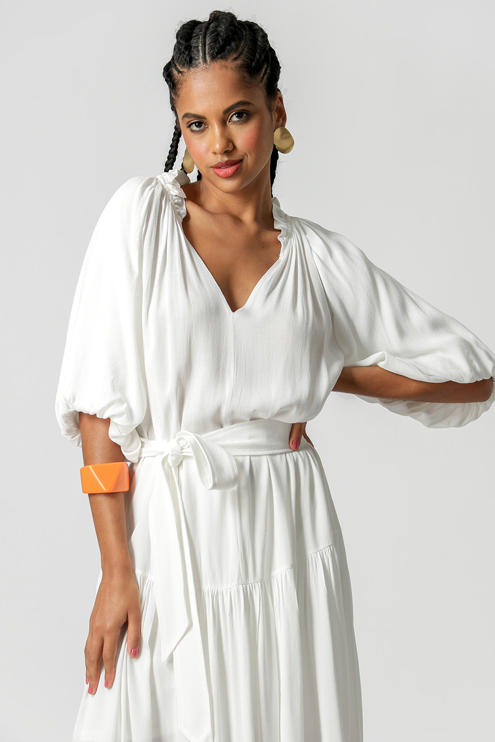Vestido de corte más holgado, con volantes, detalle fruncido en cuello y escote y mangas abullonadas. Viene con una falda a juego. ¡Pieza súper fresca, ideal para el verano!