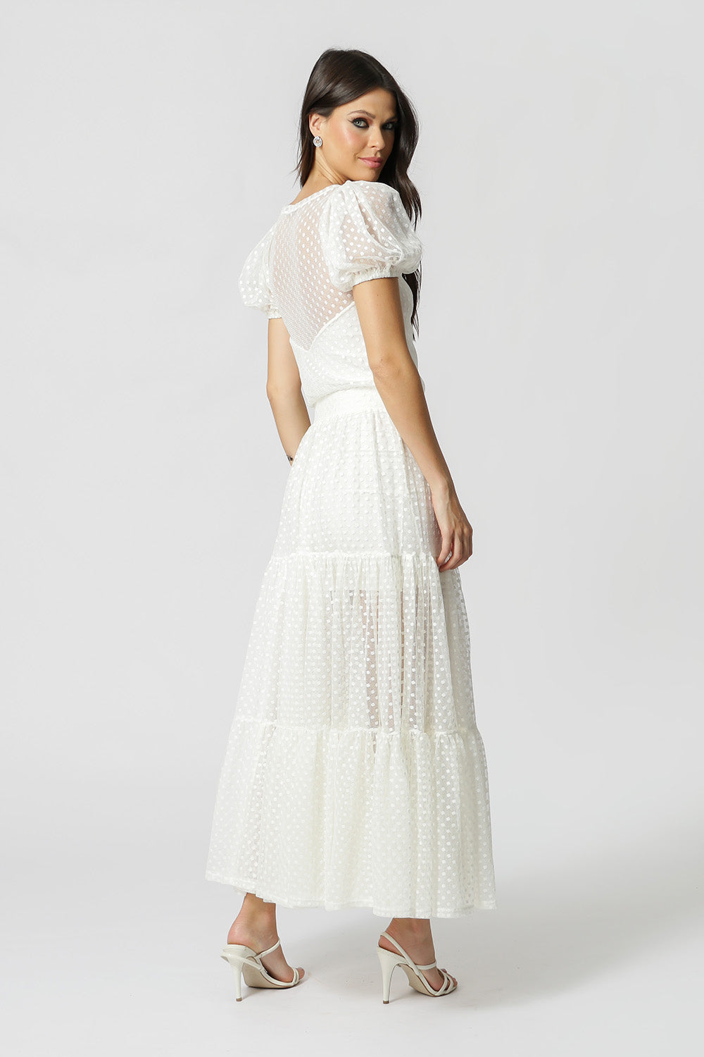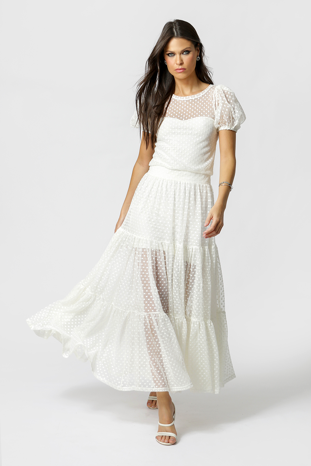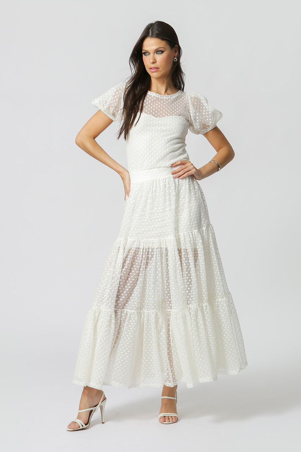 Vestido de tul de largo medio con mangas abullonadas y cinturilla elástica. Pieza confeccionada en tejido de tul con detalles y forro de malla. Un modelo elegante y delicado, perfecto para quienes gustan de un ambiente más casual y romántico.