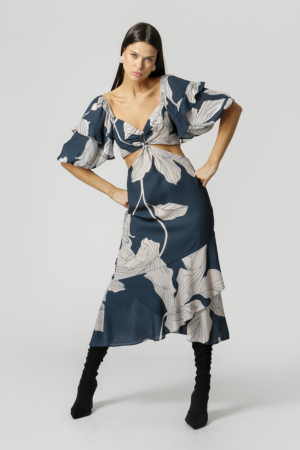 Vestido midi con mangas abullonadas, detalle de volantes y aberturas. Cierre de cremallera. Pieza forrada. Pieza casual que tiene ese estilo elegante que nos encanta.