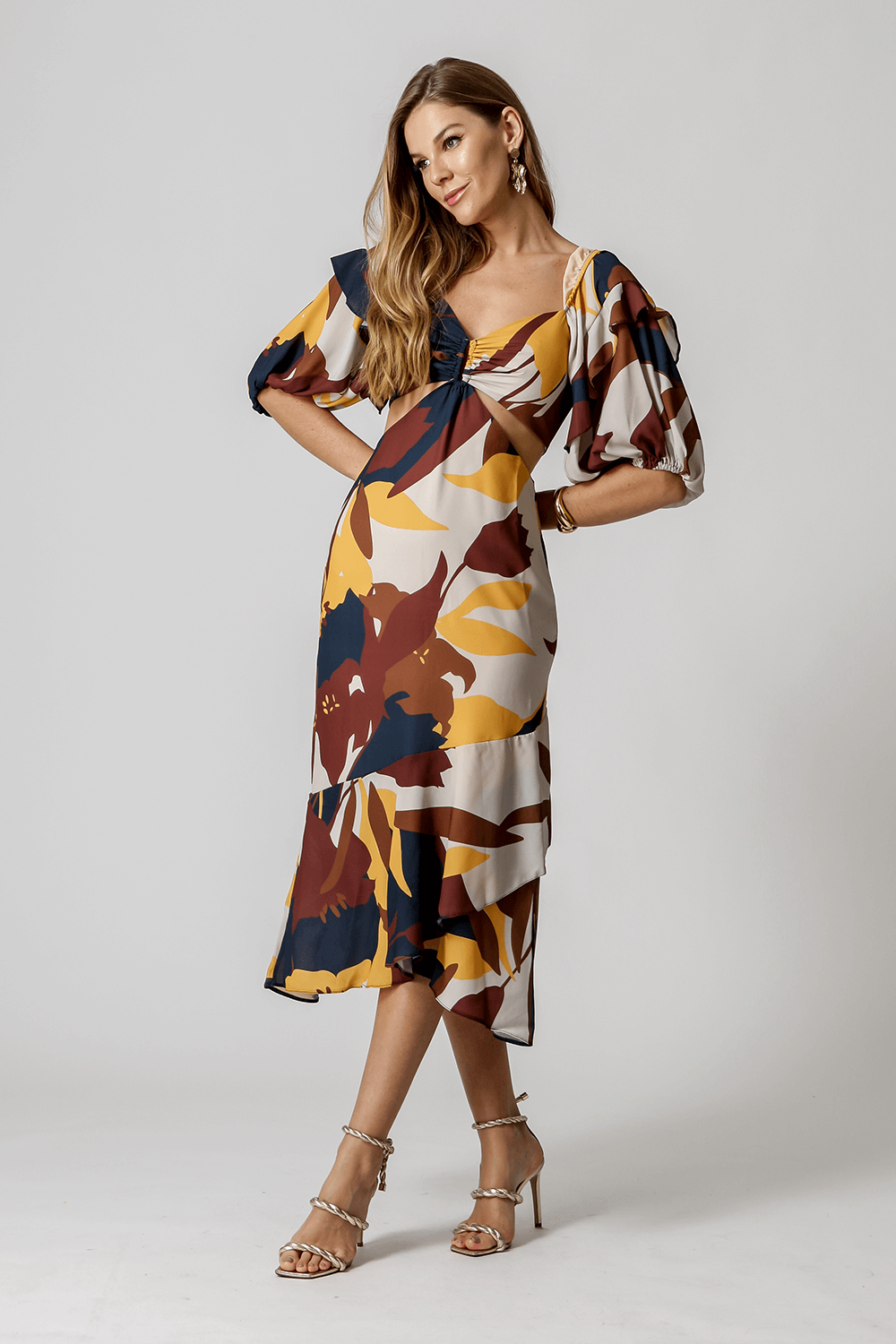 Vestido midi con mangas abullonadas, detalle de volantes y aberturas. Cierre de cremallera. Pieza forrada. Pieza casual que tiene ese estilo elegante que nos encanta.