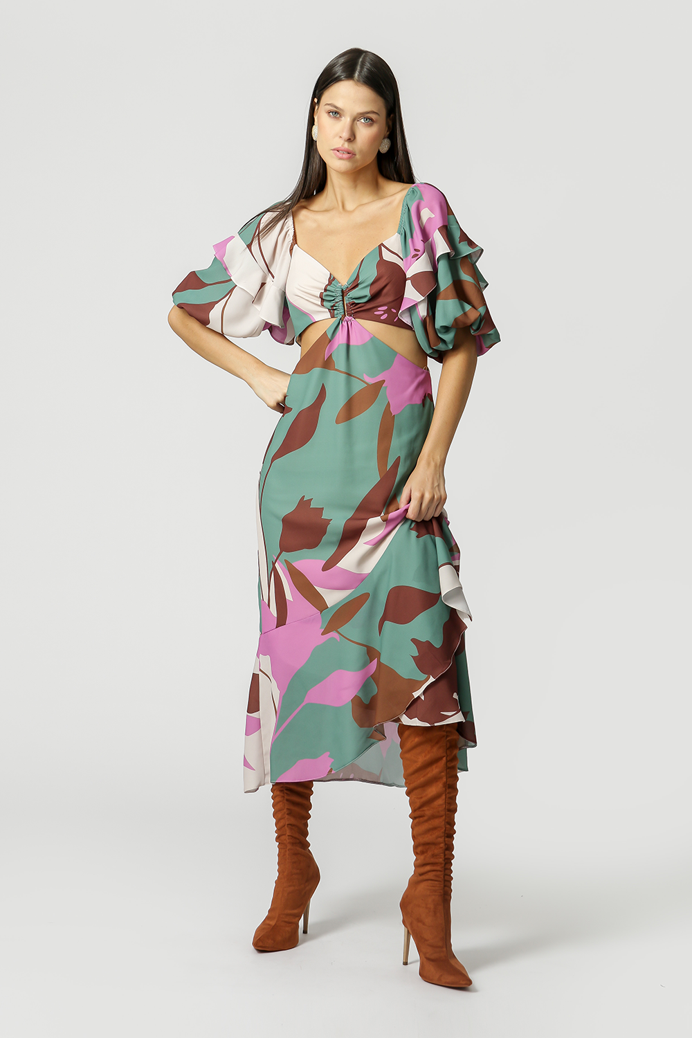 Vestido midi con mangas abullonadas, detalle de volantes y aberturas. Cierre de cremallera. Pieza forrada. Pieza casual que tiene ese estilo elegante que nos encanta.