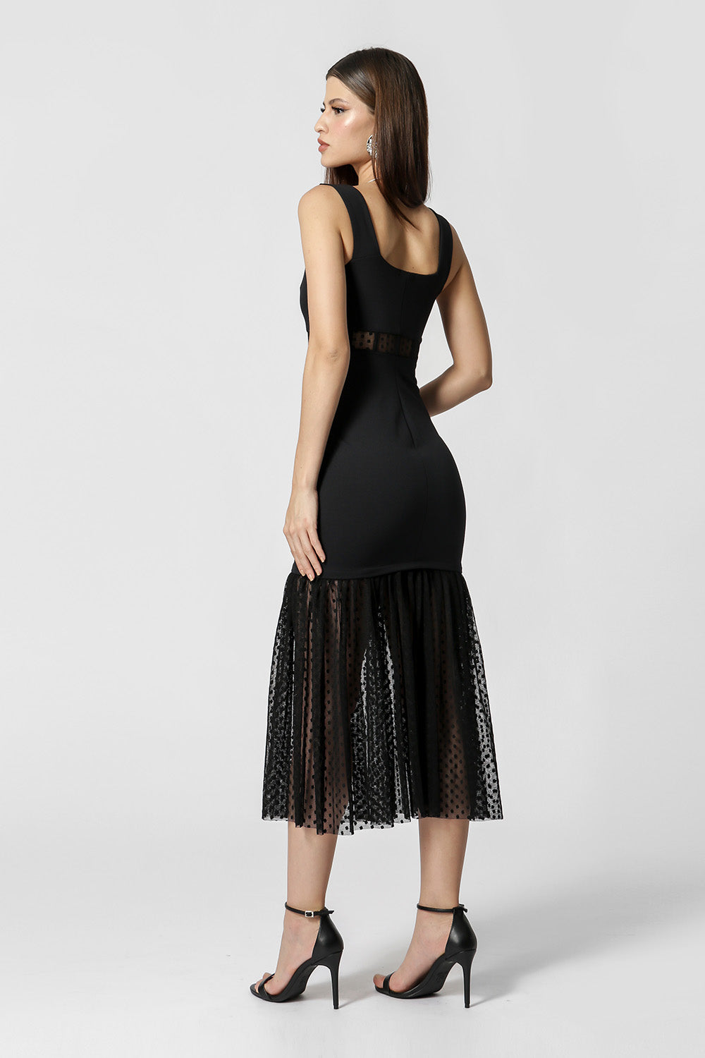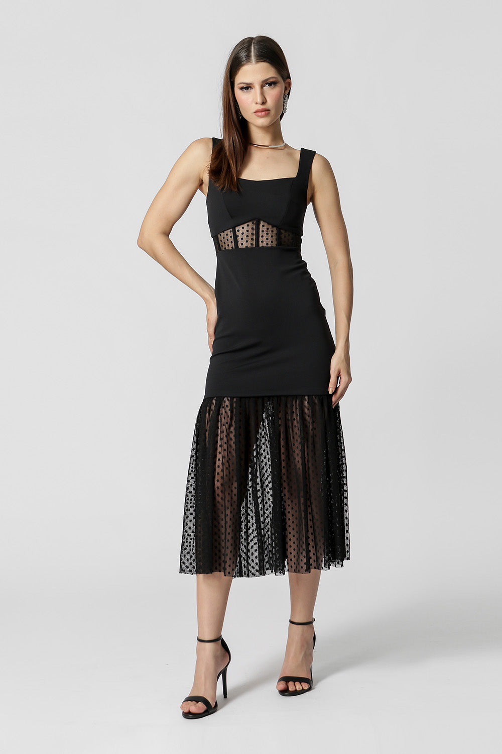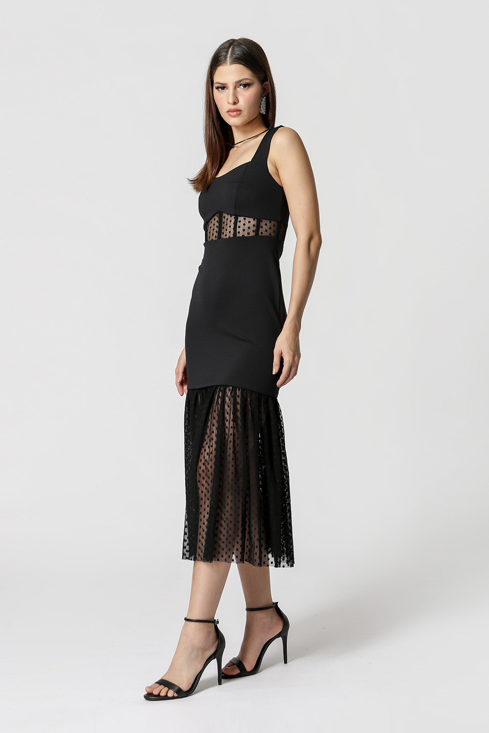 Vestido midi con corte que se ajusta mejor al cuerpo, con cortes y mezcla de tejidos. ¡Un look para que luzcas espectacular!