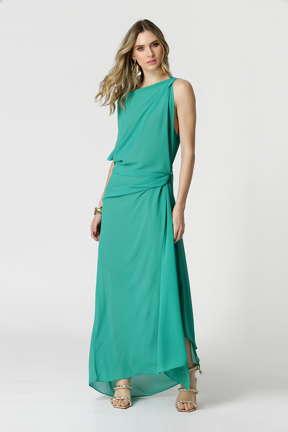 Vestido midi con detalle de giro en la cintura. Fabricado en tejido crepe fluido con ligera transparencia. Viene con un forro con tirantes ajustables para usar debajo del vestido.
