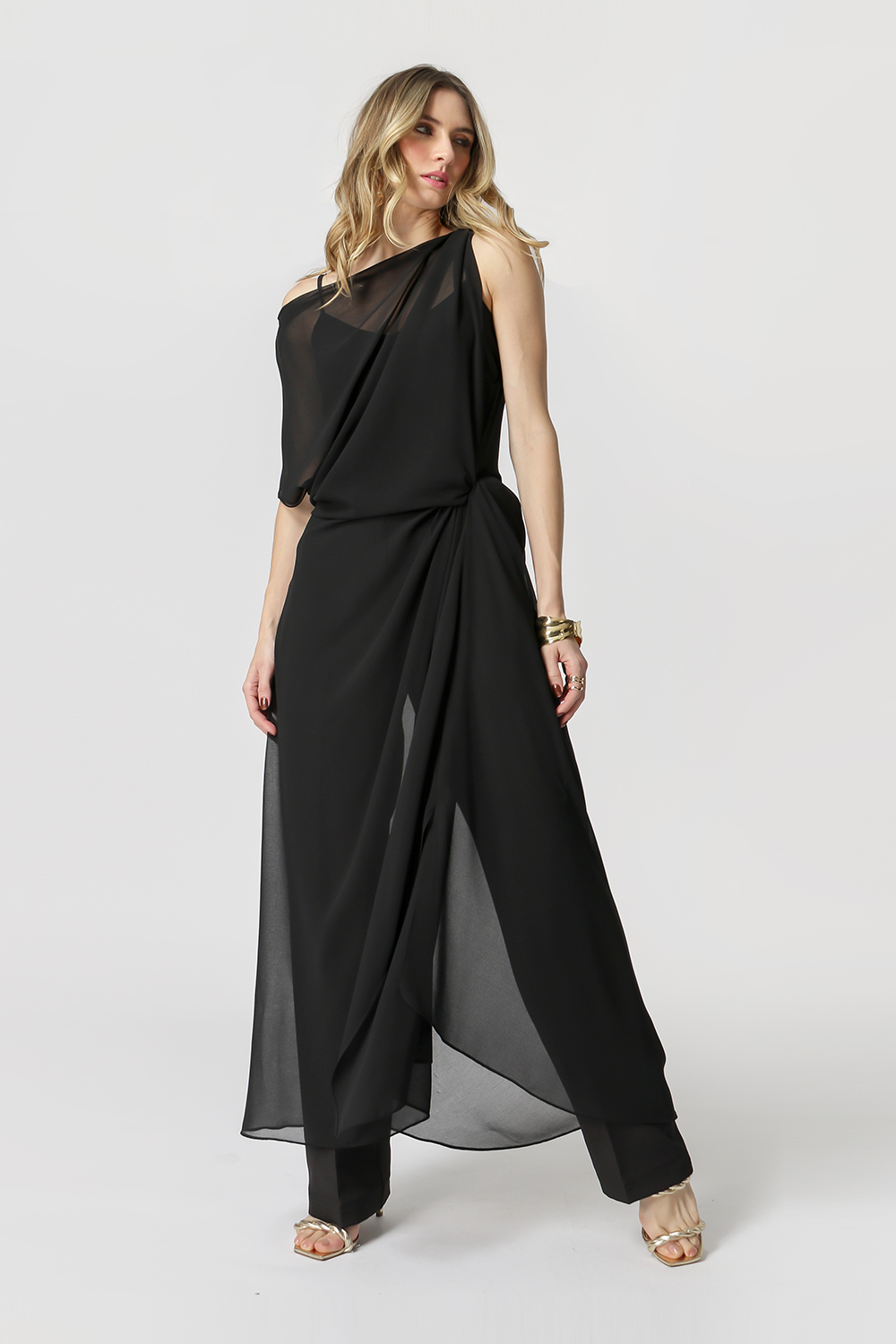 Vestido midi con detalle de giro en la cintura. Fabricado en tejido crepe fluido con ligera transparencia. Viene con un forro con tirantes ajustables para usar debajo del vestido.