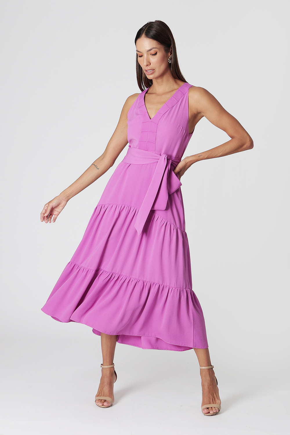 Vestido escote pico y detalle acanalado. Largo midi con dobladillo. Tiene cremallera lateral invisible, forro y tira para atar. Pieza casual que tiene ese estilo elegante que nos encanta.